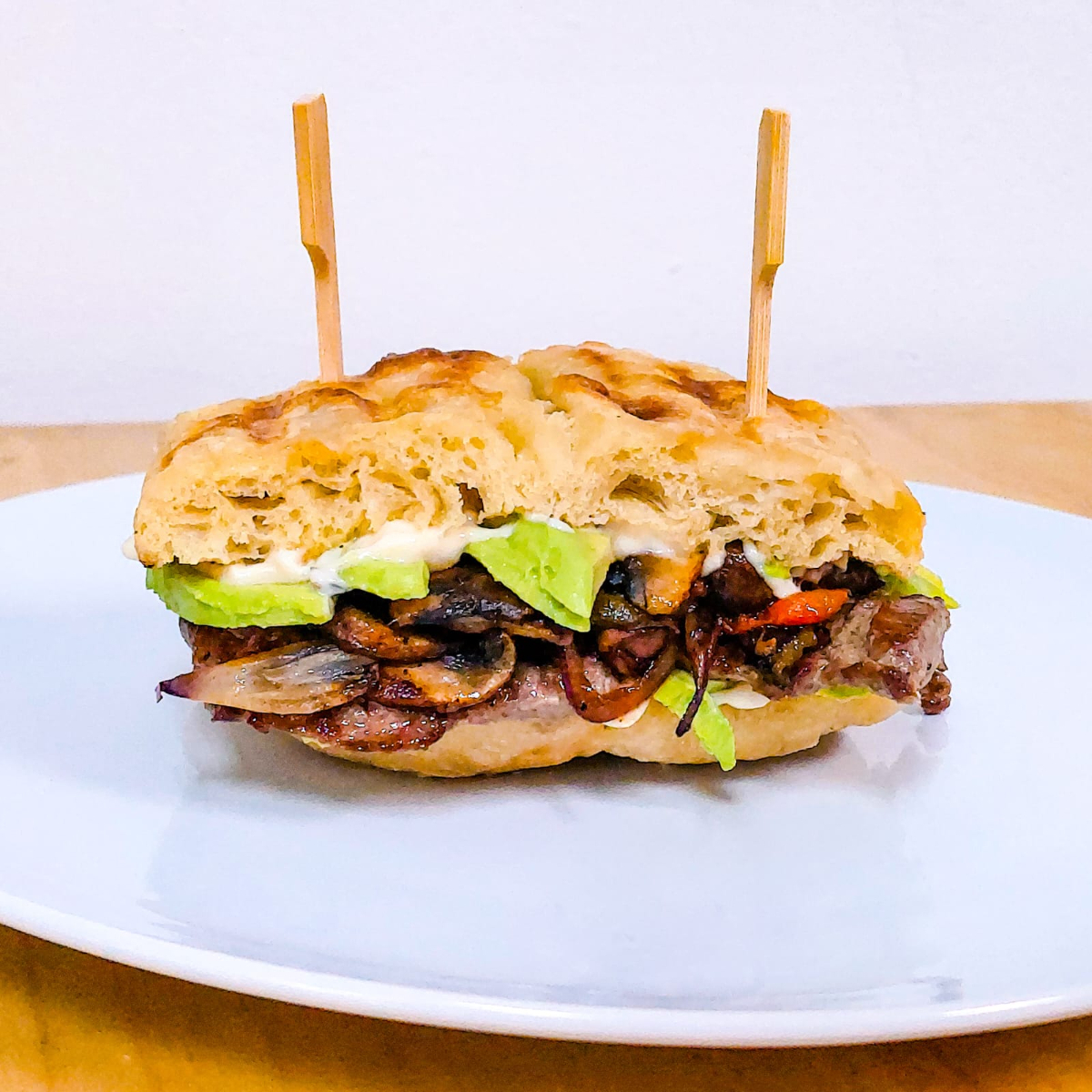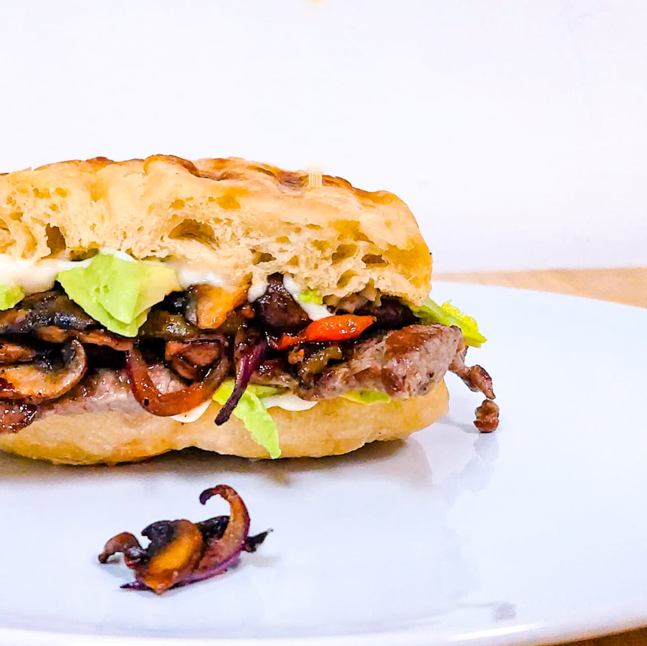 Sándwich de pan de masa madre tostado con carne de res salteada junto a cebolla morada, chile dulce y hongos, servido en un alioli, acompañado de chips.