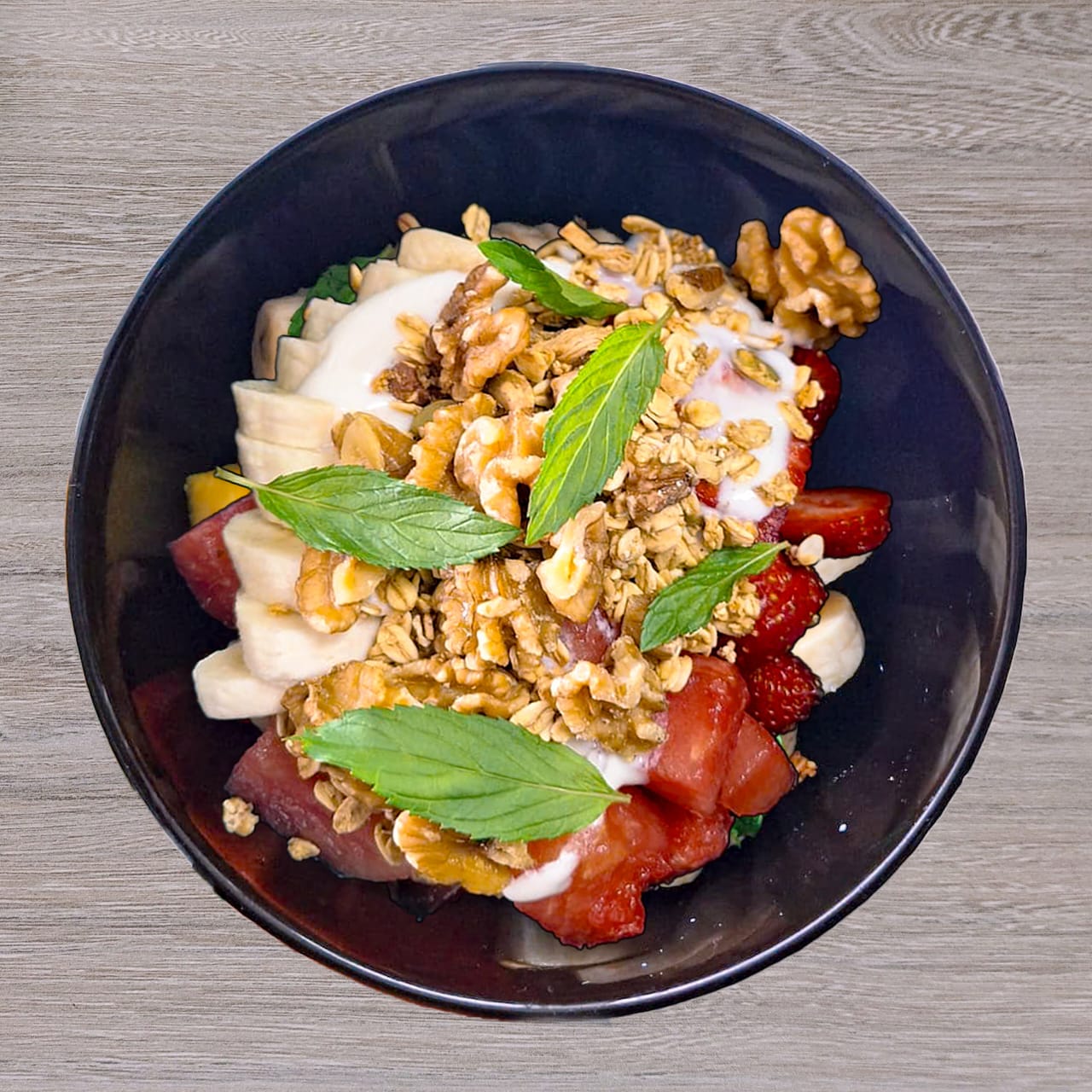 Sandía, fresa, banano, granola, nuez de nogal, miel, hojas de menta, yougurt griego.