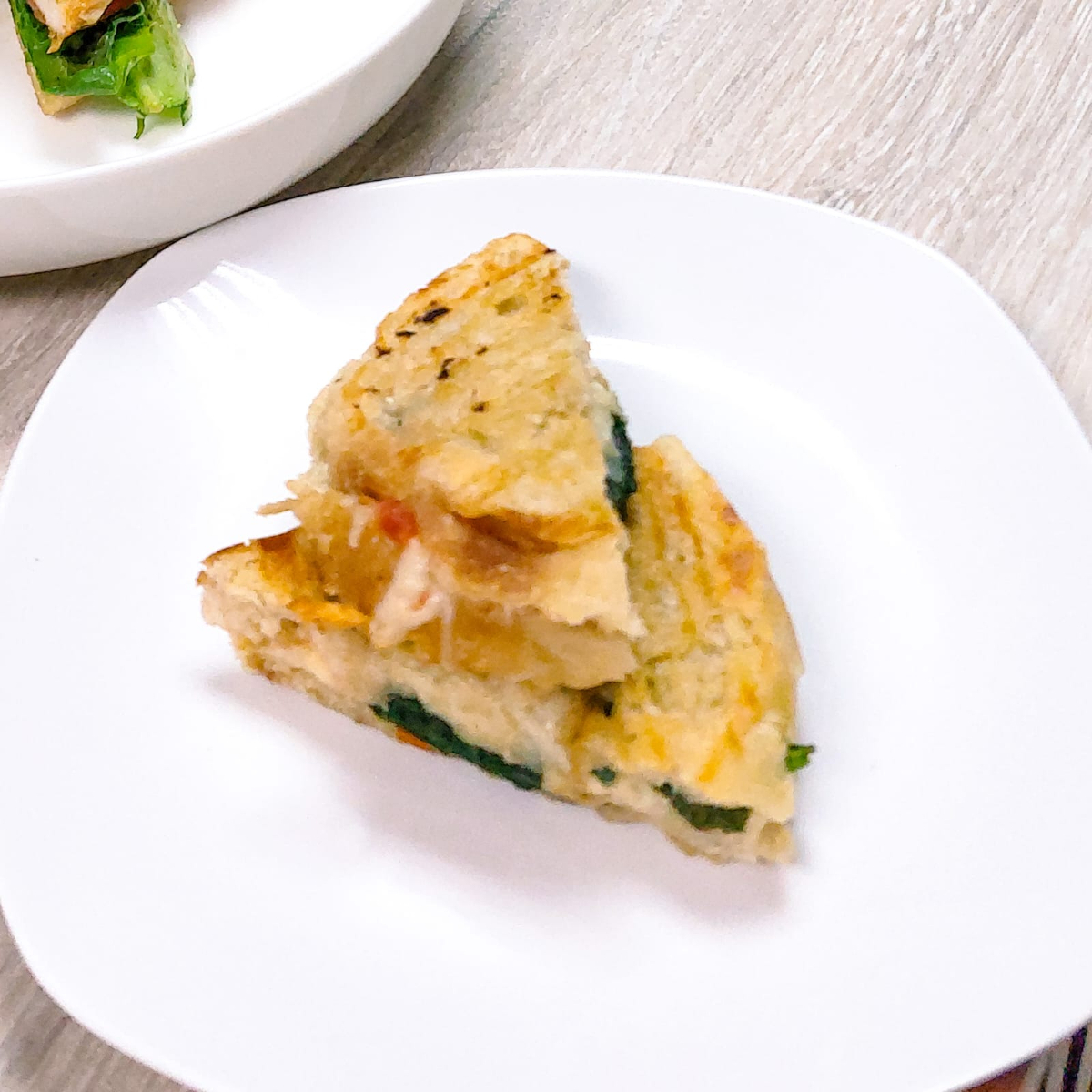 Sándwich de pan de masa madre tostado con mezcla de quesos, tomate y espinaca, acompañado de chips.