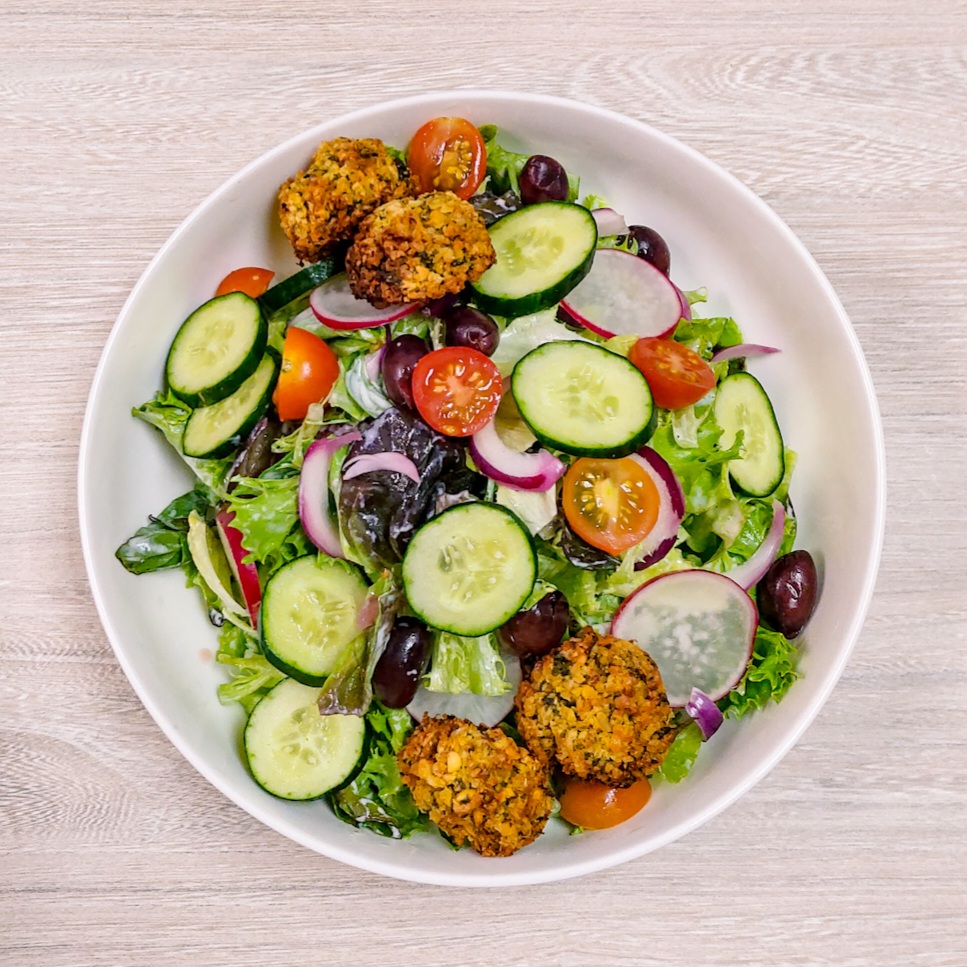 Mezcla de lechugas, rábano, pepino, aceitunas kalamata, cebolla morada, tomate cherry, falafel, hojas de albahaca y menta, aderezo de tahini limón.