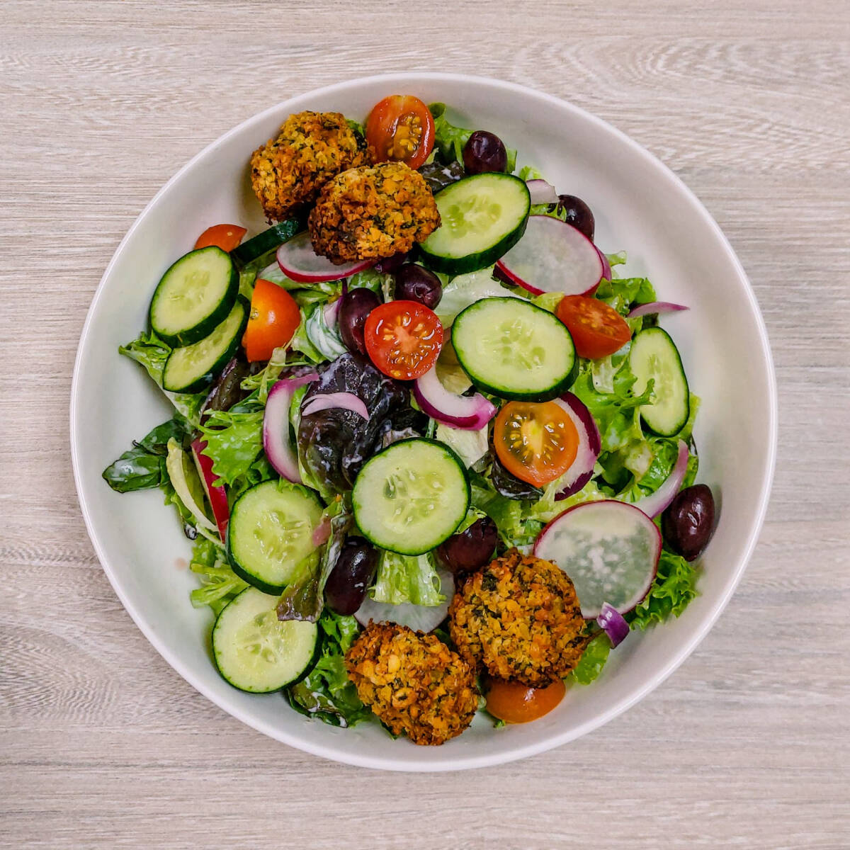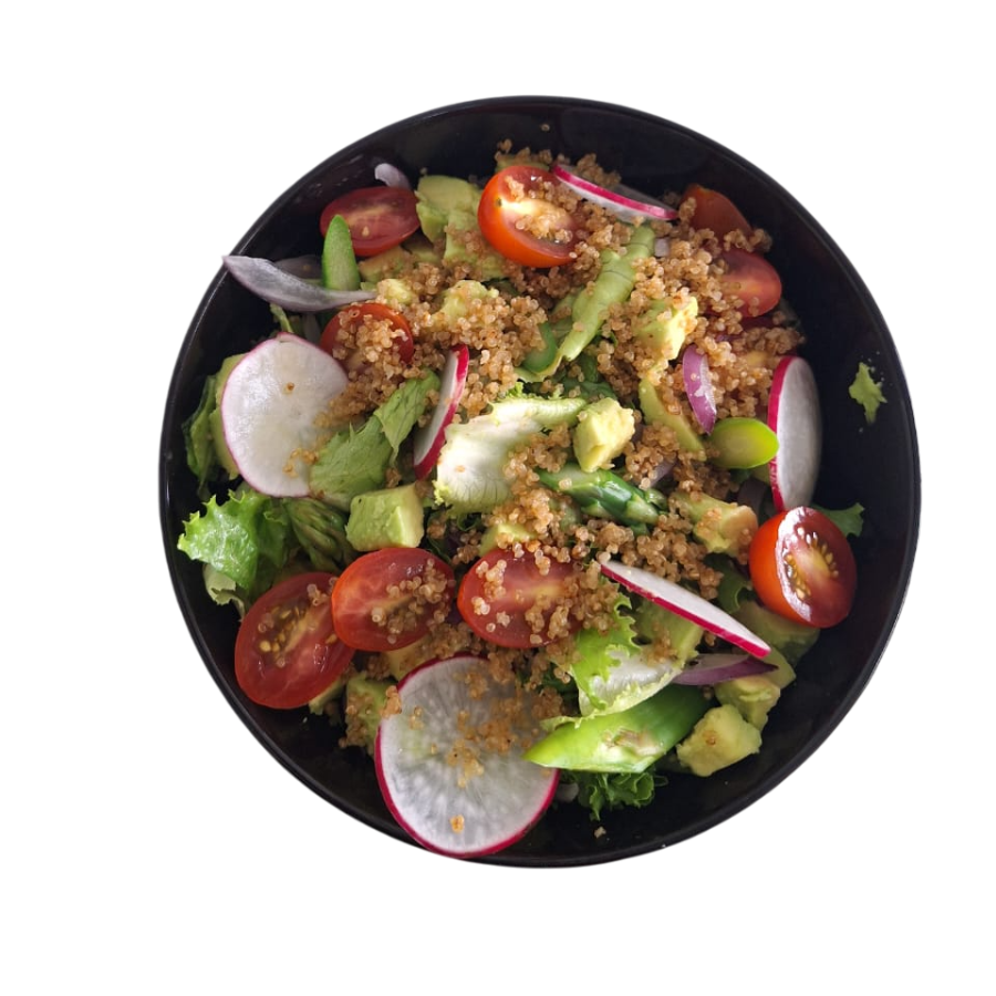 Mezcla de lechuga, esparrago, rabanito, tomate cherry, aguacate, cebolla morada, eneldo, quinua, aderezo de mostaza limón.