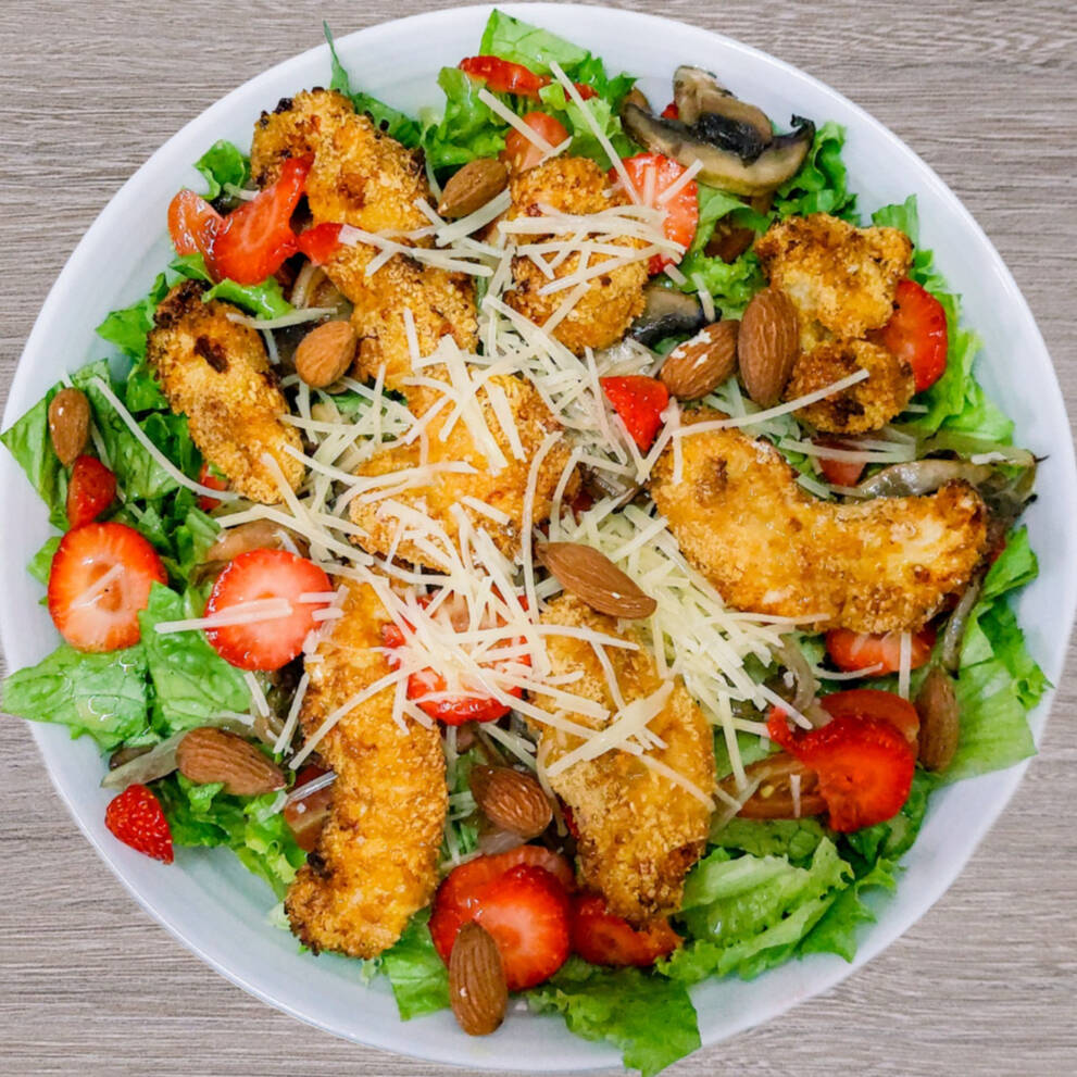 Mix de lechugas, fresas en rodajas, almendras, cebolla y hongos salteados, queso parmesano y fajitas de pollo empanizadas. Acompañados de vinagreta de naranja y miel