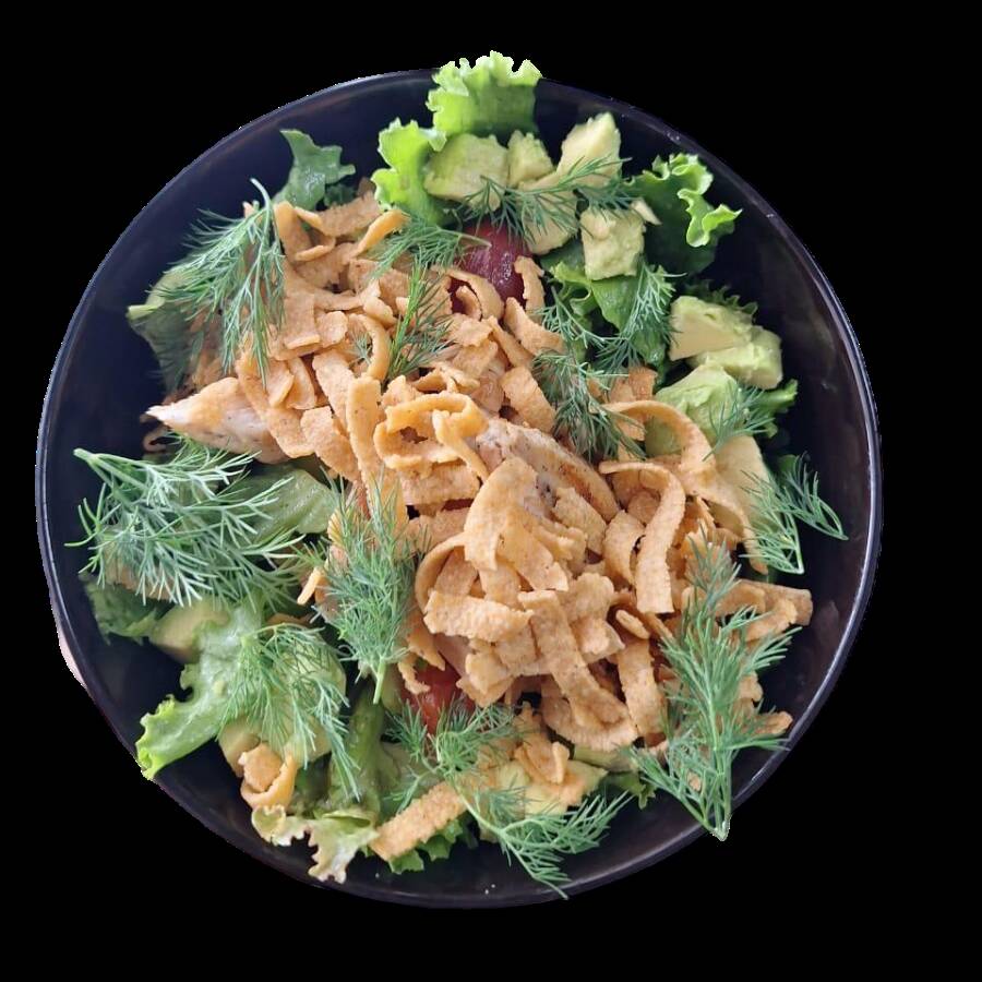 Mezcla de lechugas, pollo a la parrilla, aguacate, hojas de eneldo, chips, tomate cherry confitado, aderezo de naranja miel.