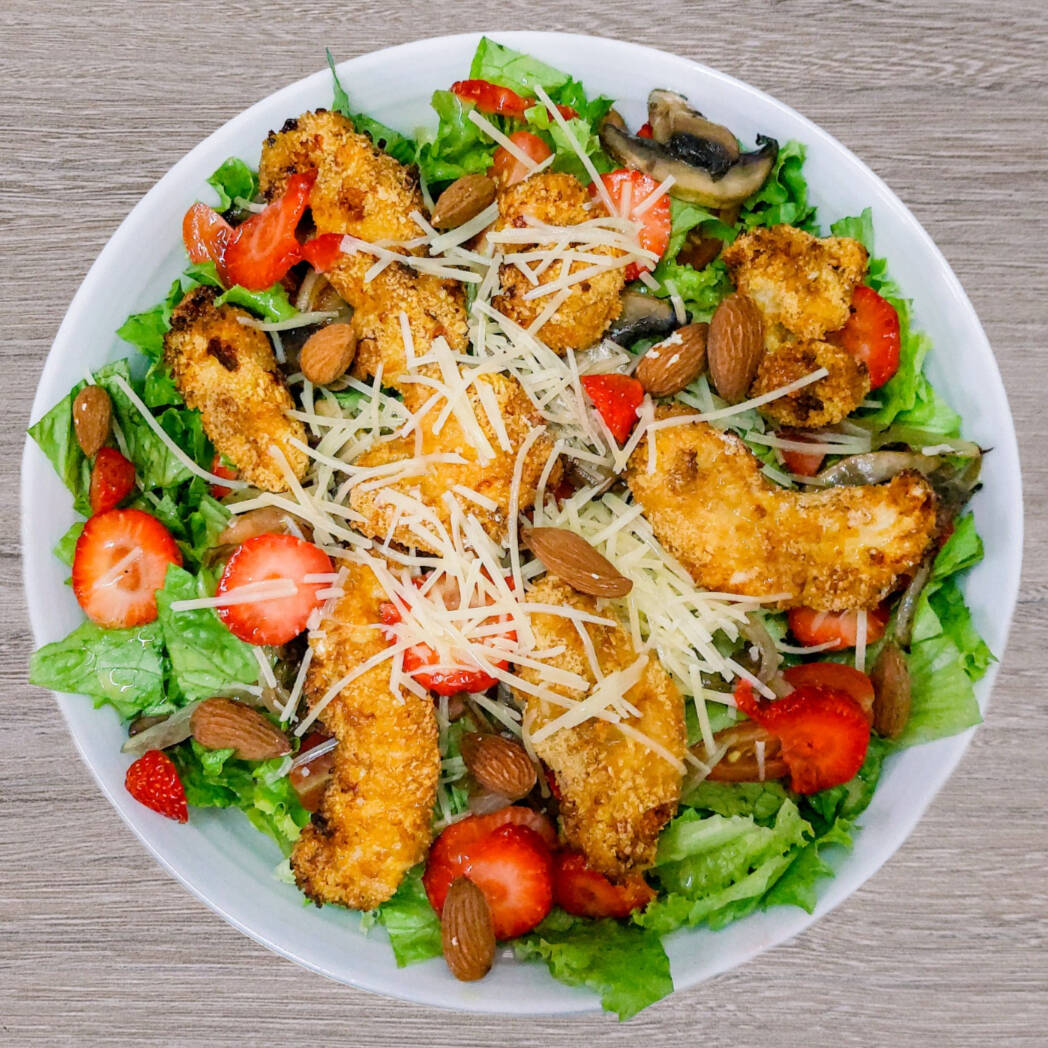 Mix de lechugas, fresas, queso parmesano, hongos y cebolla salteados, tomate cherry, almendras y fajitas de pollo empanizado