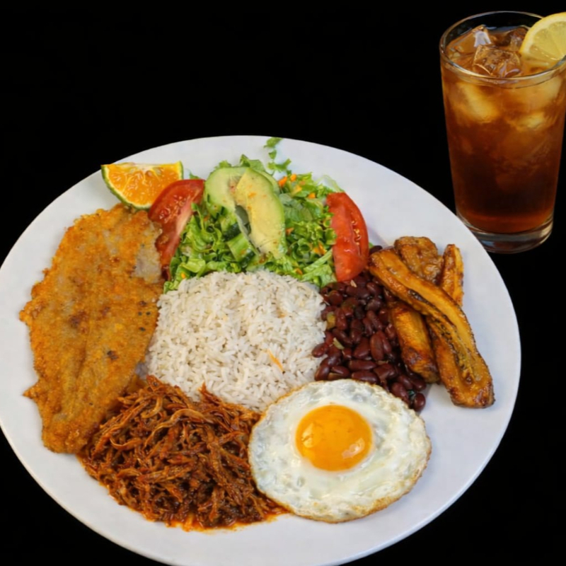 Arroz, frijoles, vegetales, plátano, huevo, proteína y té frío.