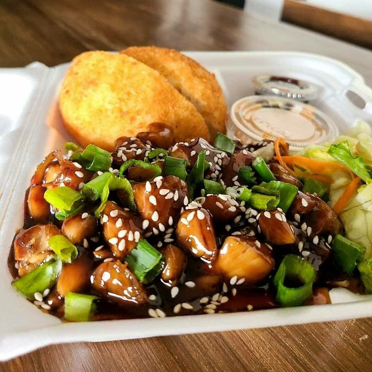 Arroz frito con huevo y vegetales, incluye 5 piezas de sushi, 1 gyozas frita, la proteína en teriyaki más te frío