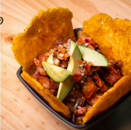 Tazón de frijol con arroz blanco, carne de cerdo, pico de gallo, acompañado con patacones y aguacate, con un toque colombiano.