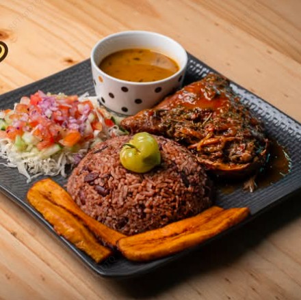 Pollo caribeño con arroz y frijoles, plátano maduro y ensalada fresca.