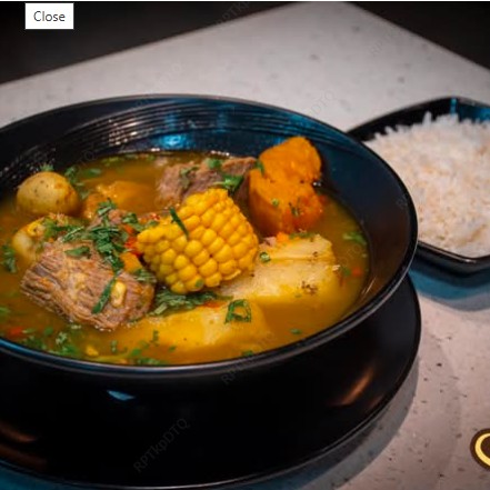 Sopa de costilla y carne en trozos, servida con arroz blanco y aguacate fresco.