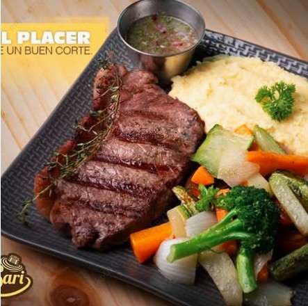 Lomo ancho de res de 300 g, servido con dos acompañamientos a elección.