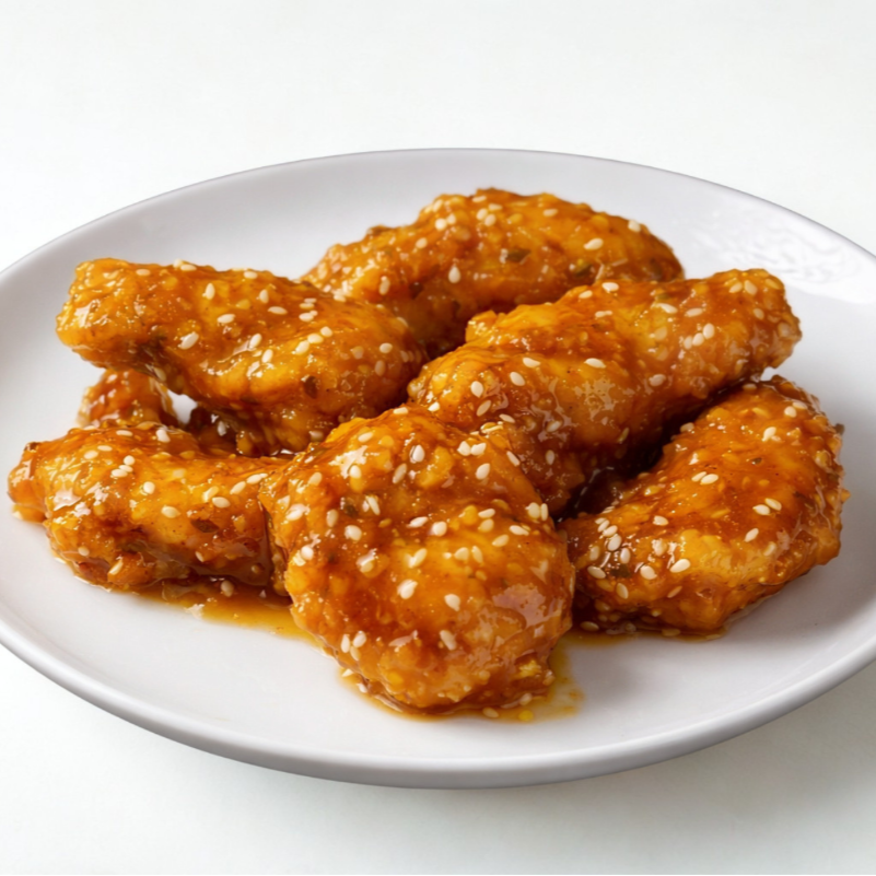 Trocitos de pollo marinado fritos y salteados con salsa naranja.