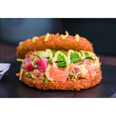 Bun de arroz sushi crujientes con wakame, trocitos de atún, trocitos de salmón, kanikama, masago, aguacate con una salsa especial.