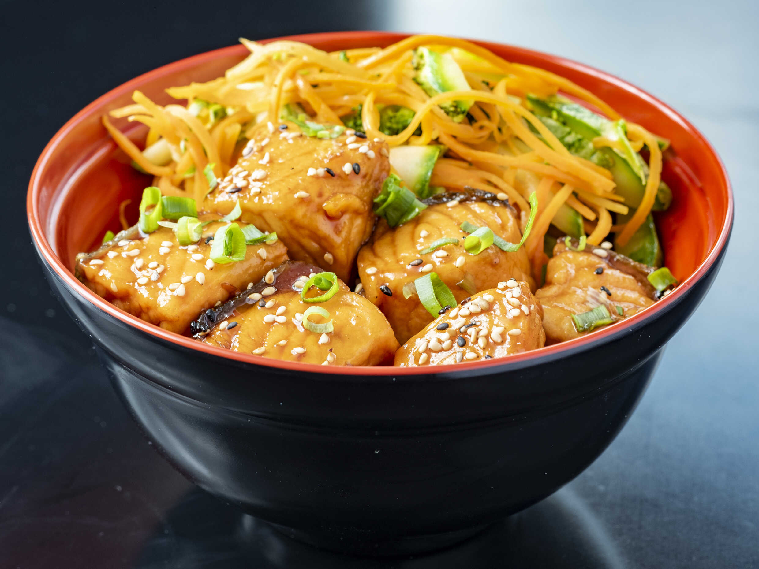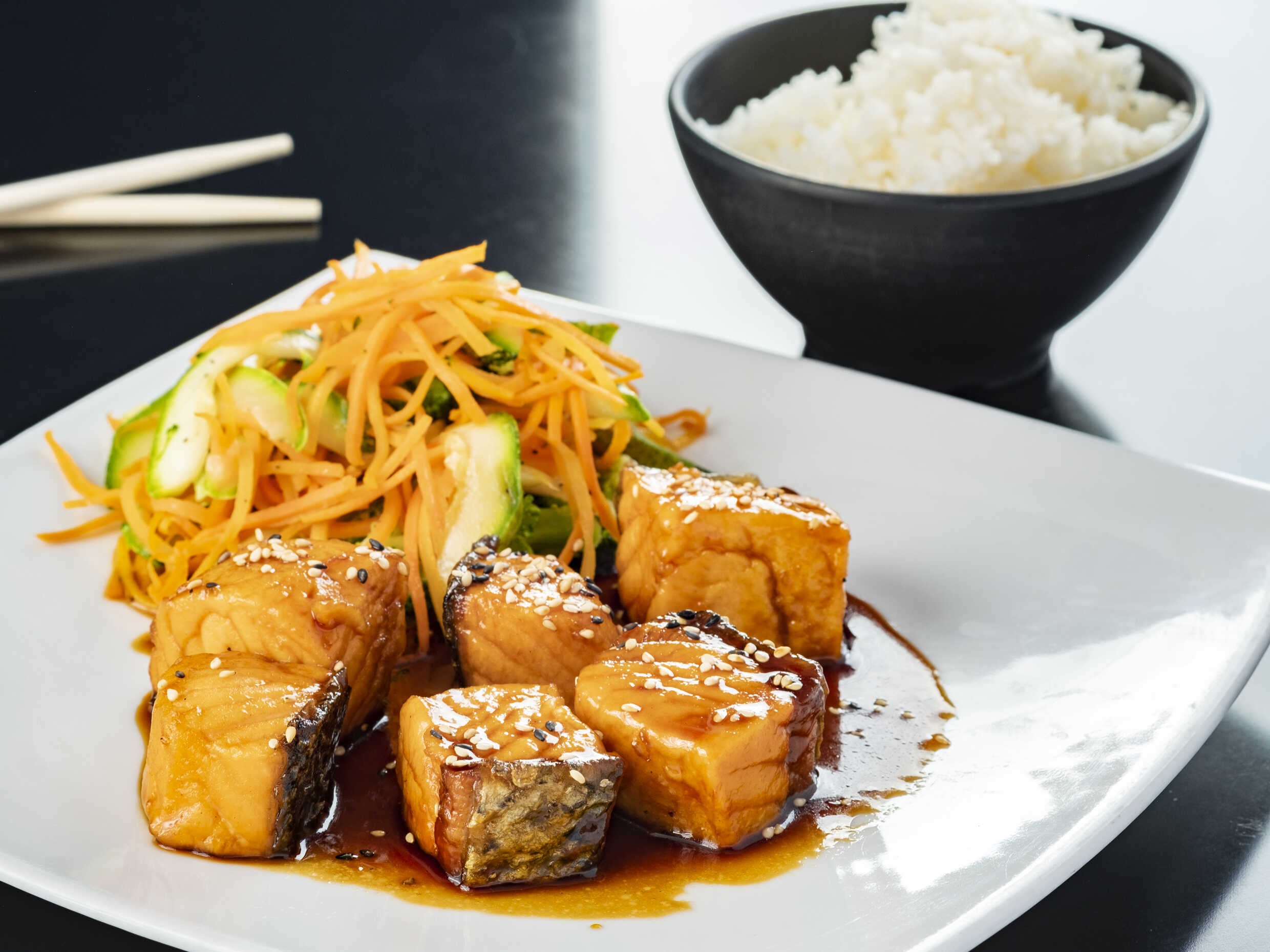 Plato Tradicional japonés, proteina a la plancha en salsa teriyaki montado sobre arroz blanco y vegetales salteados (brócoli, zuquini y zanahoria).