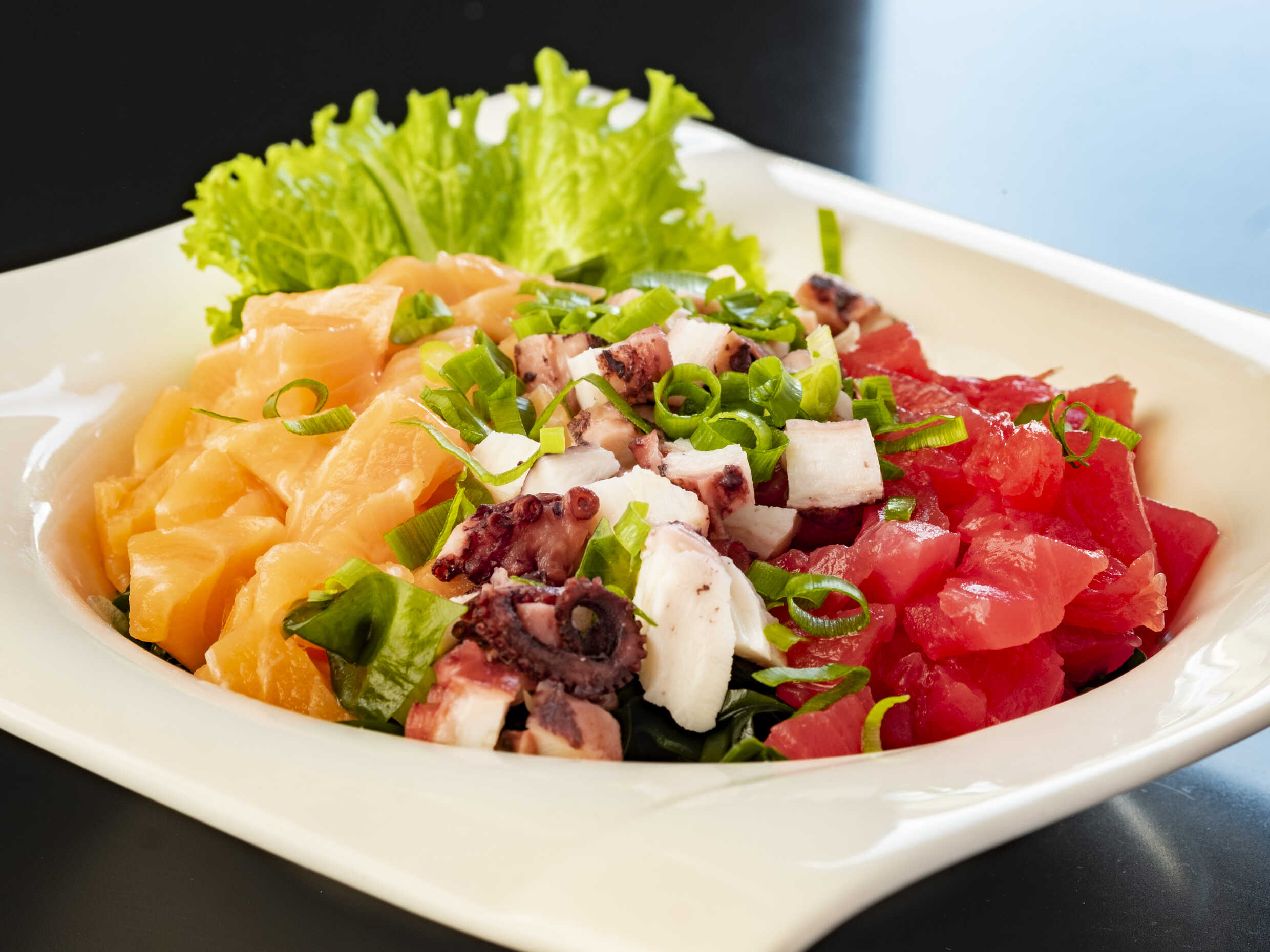 Ceviche al estilo japonés de salmón, atún y pulpo sobre una base de pepino, alga wakame y salsa cítrica. (Salmón y atún es crudo)