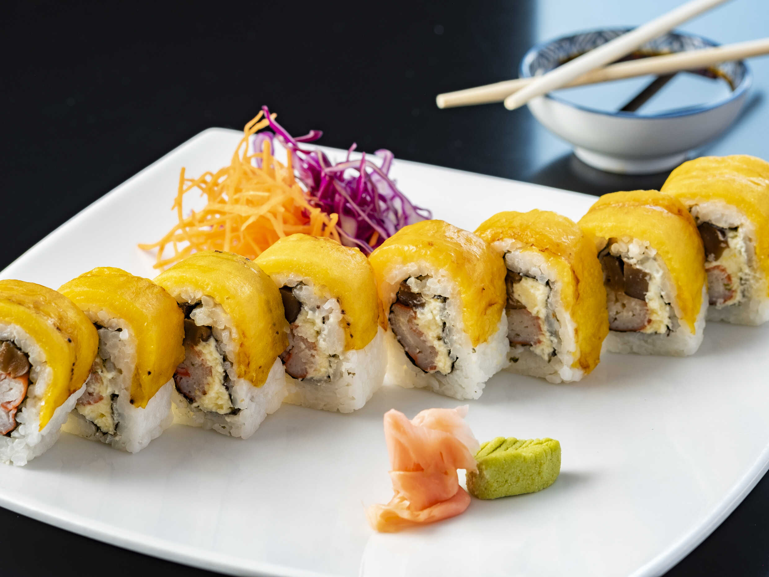 Kanikama, hongo shitake, queso crema, cobertura de plátano maduro y salsa de anguila. 8 piezas.