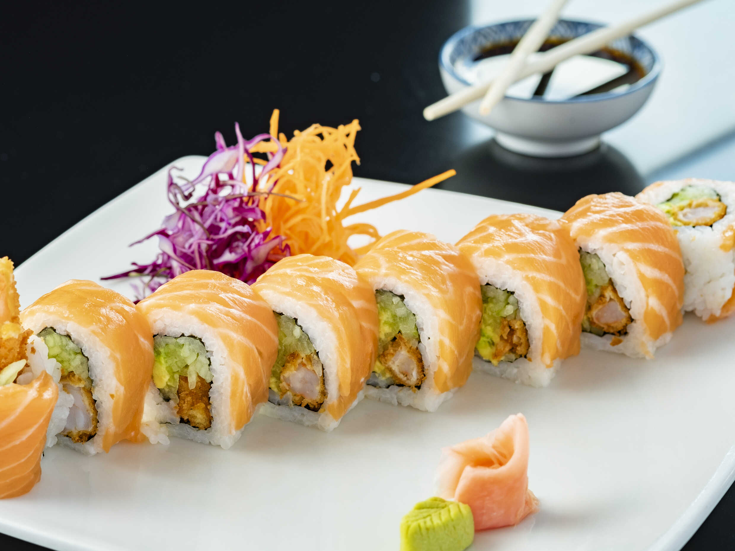 Salmón, camarón, atún, kanikama, queso crema, cobertura de Masago. 8 piezas