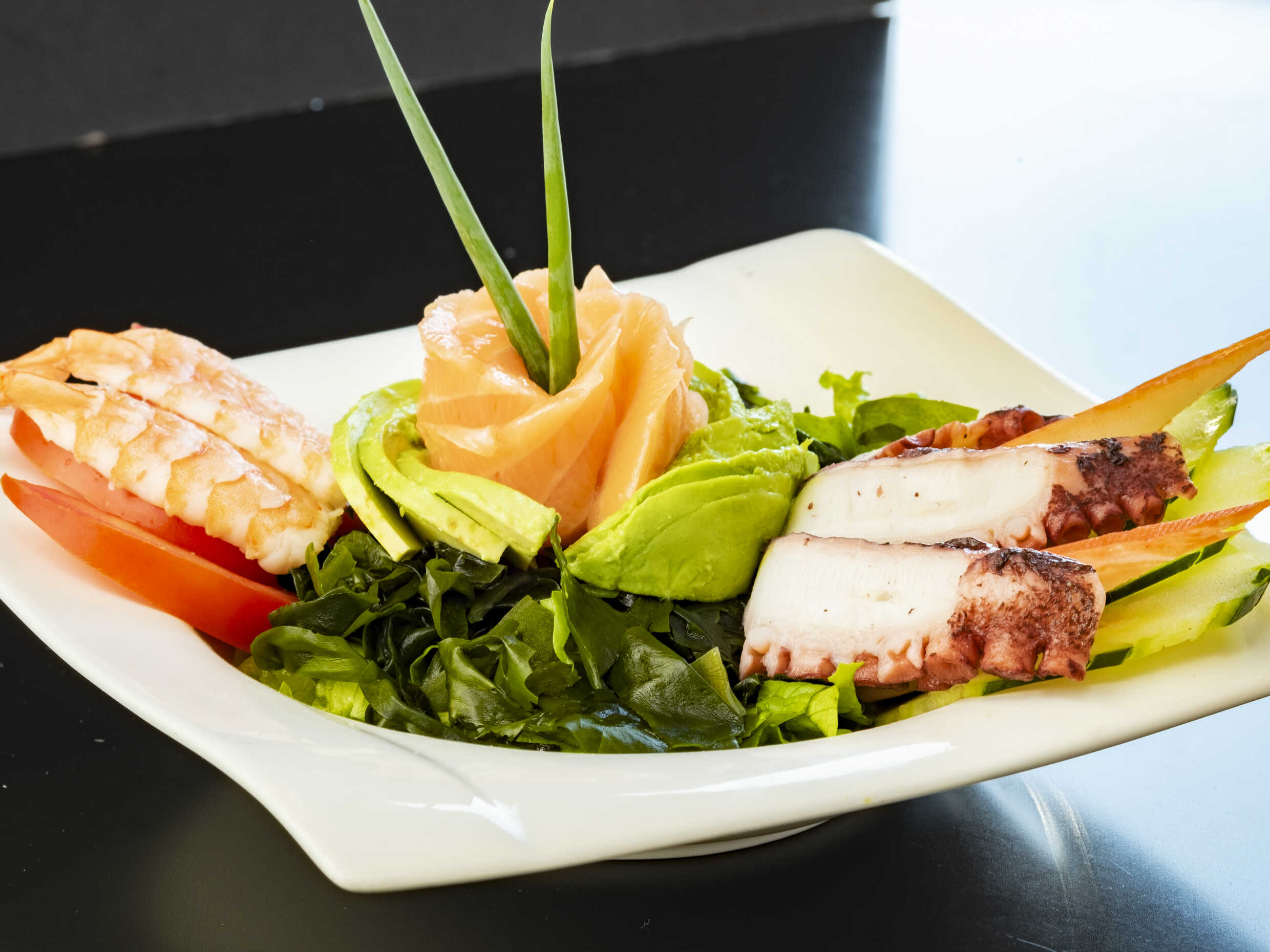 Lechuga, tomate, pepino, alga wakame, pulpo, salmón ahumado, camarón, aguacate y kanikama.