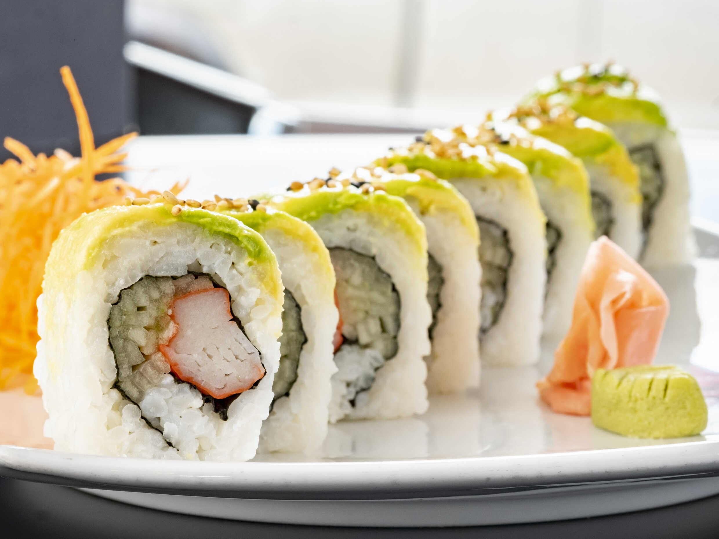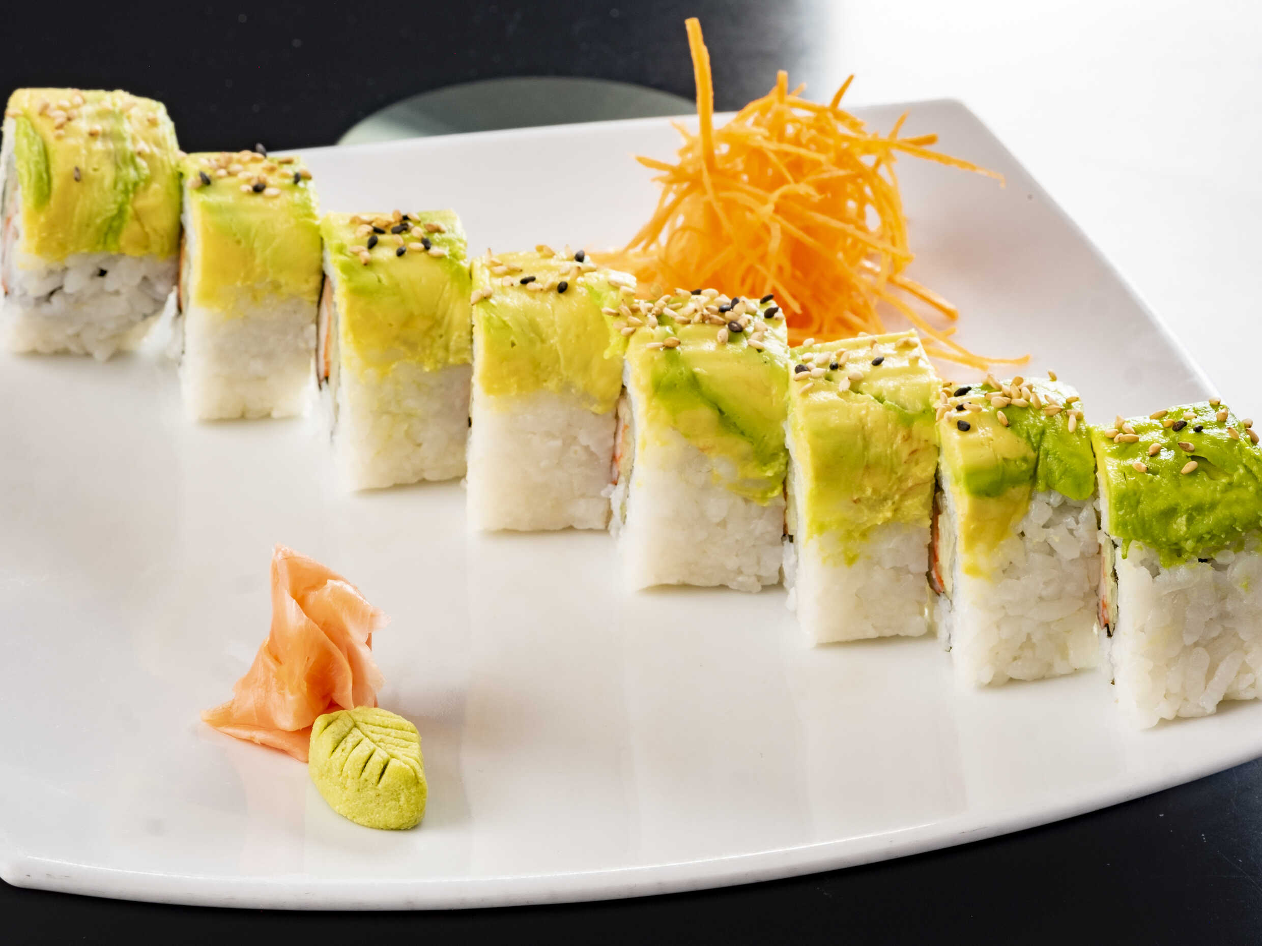 Camarón tempura, mayonesa, pepino y cobertura de aguacate. 8 piezas.