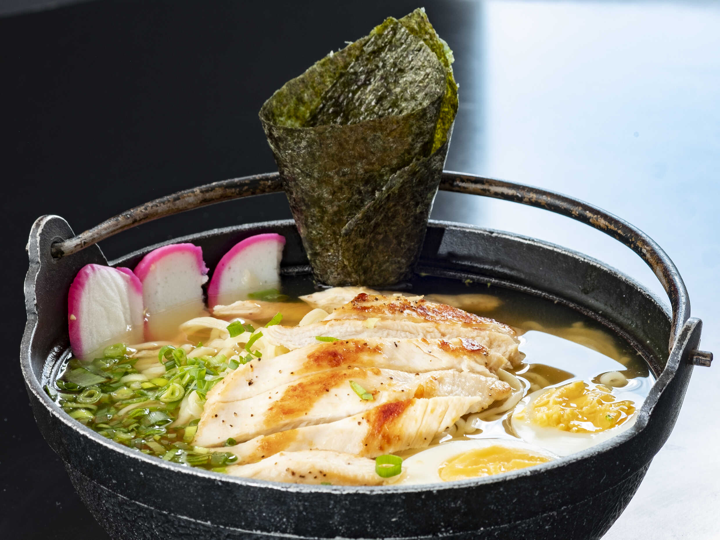 Sopa de fideos ramen con huevo, cebollino, hongos