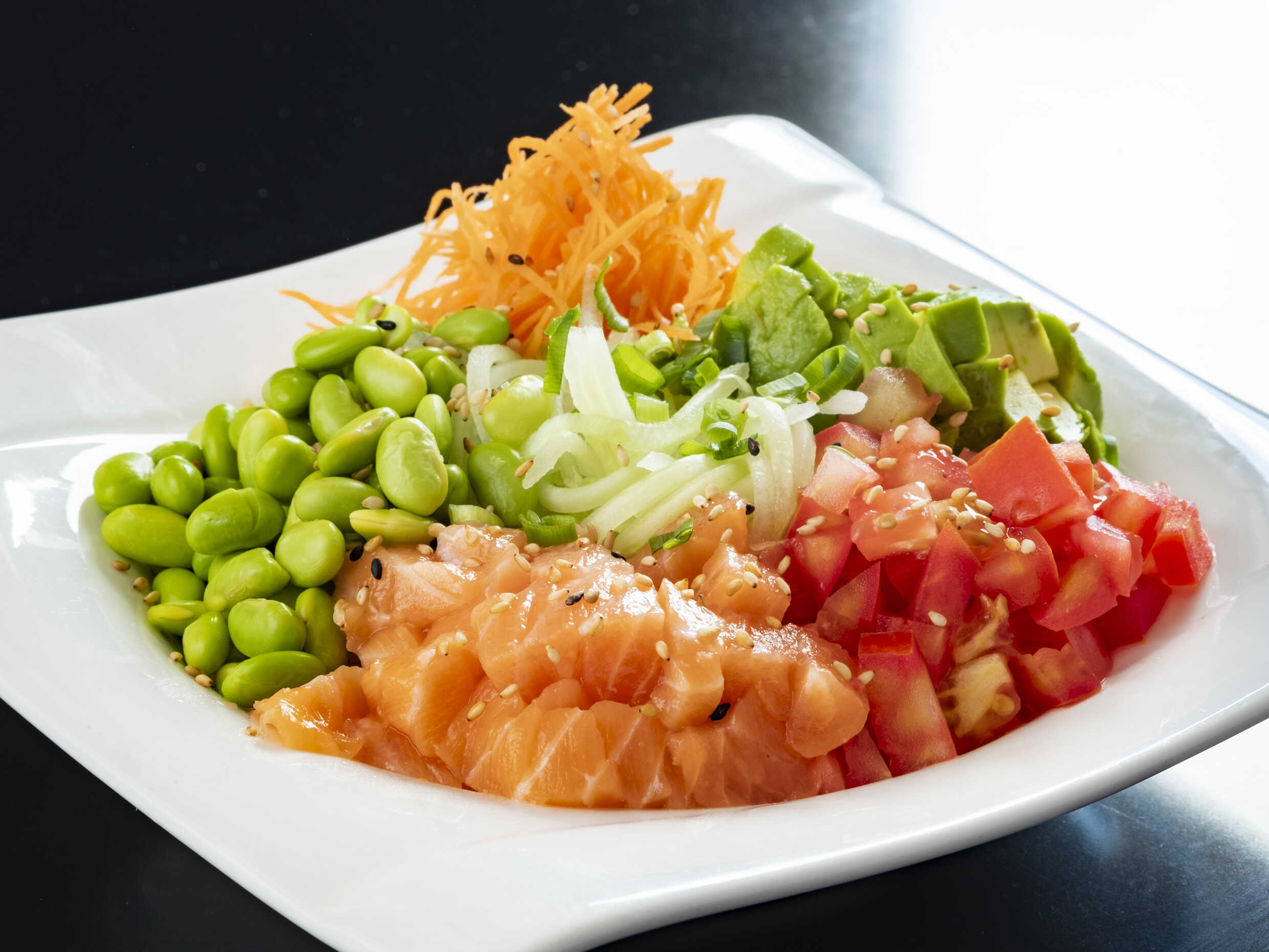 Base de Arroz de sushi, salmón, aguacate, edamame, tomate, pepino y zanahoria rayada. Semillas de ajonjoli, cebollino. Salsa de soya y vinagreta de frambuesa por aparte.