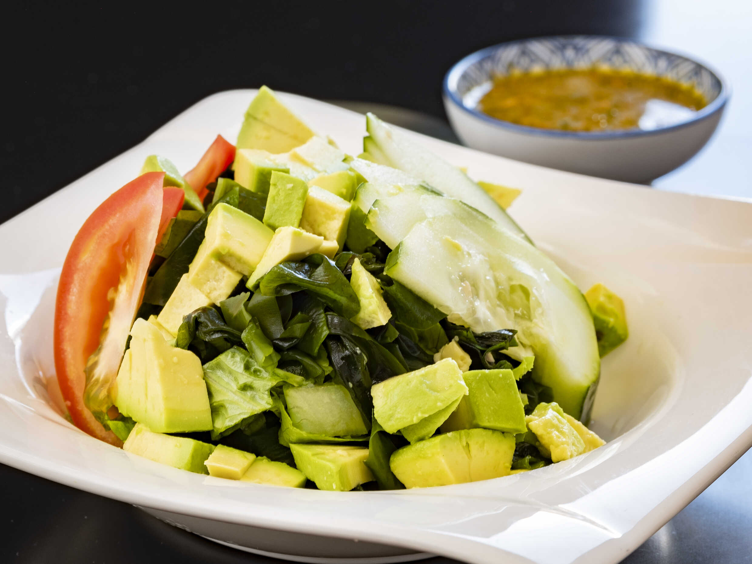 Alga Hiyashi Wakame, alga wakame, aguacate, lechuga, tomate, pepino y aderezo de la casa