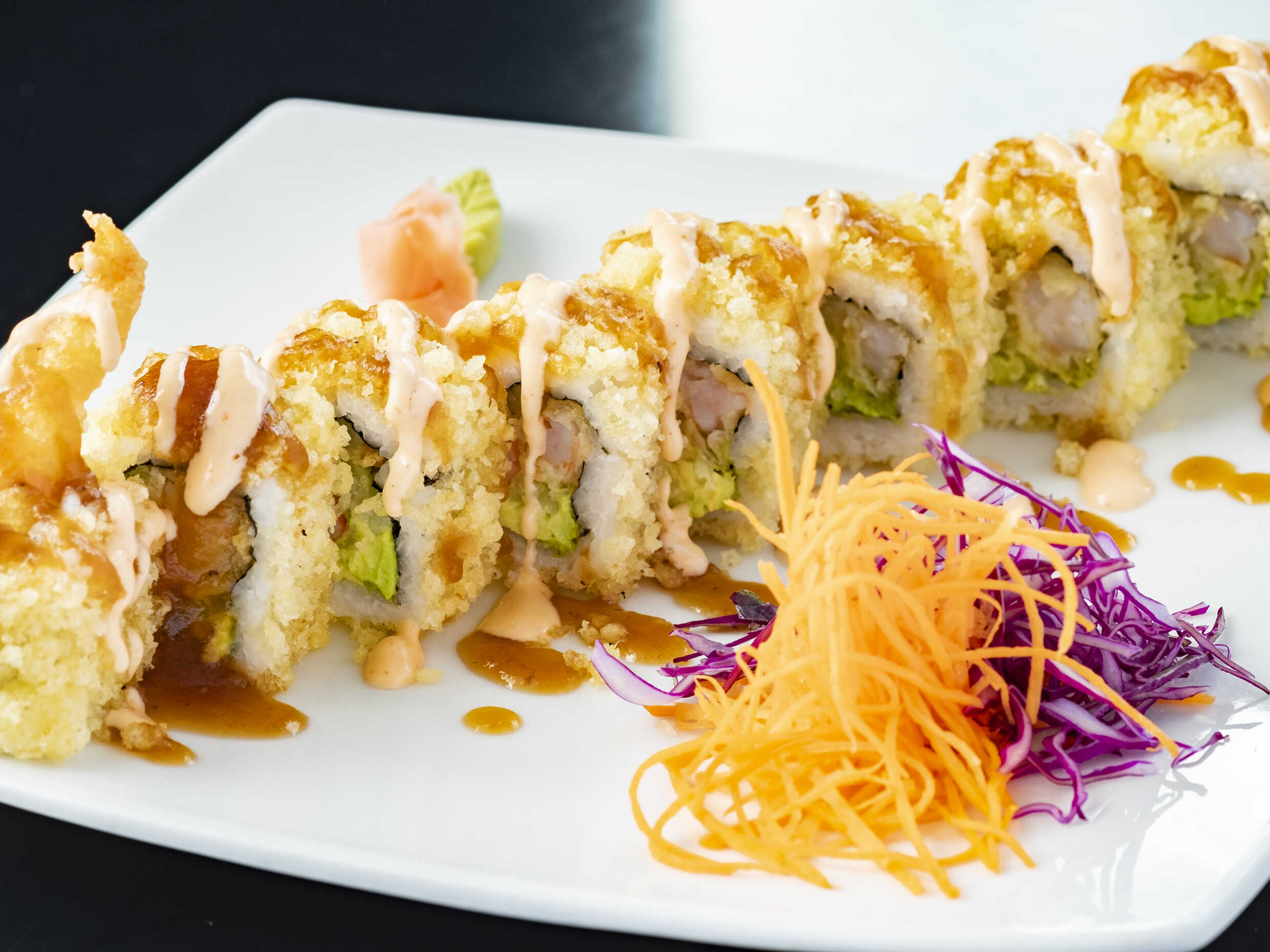 Camarón tempura, pepino, aguacate, kanikama,mayonesa, cobertura completa de tempura molida con salsa de anguila y salsa ranch especial. 8 piezas.
