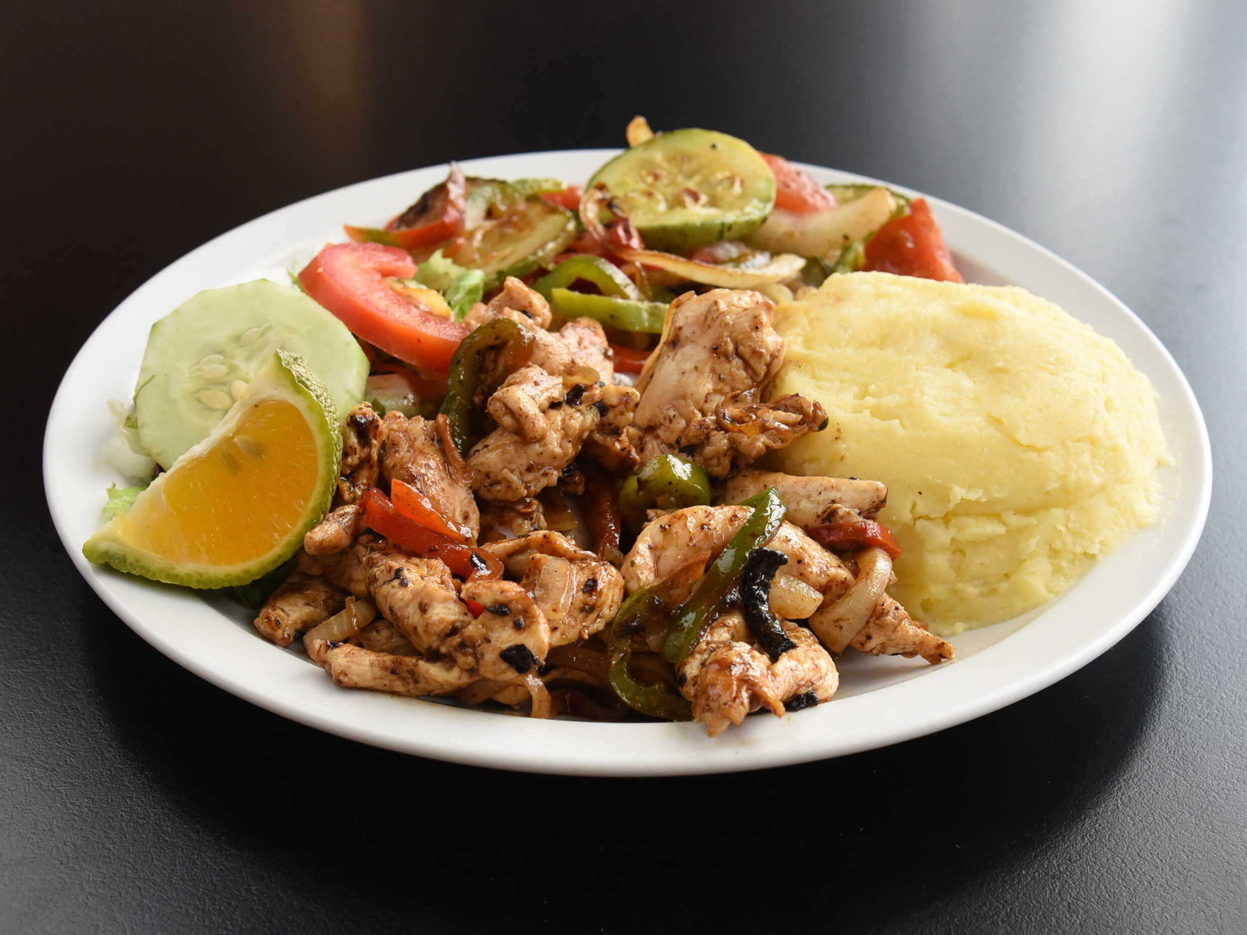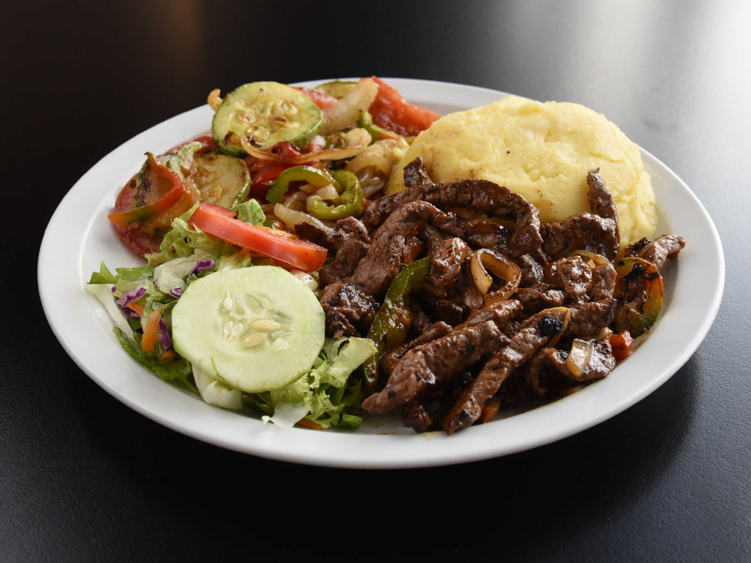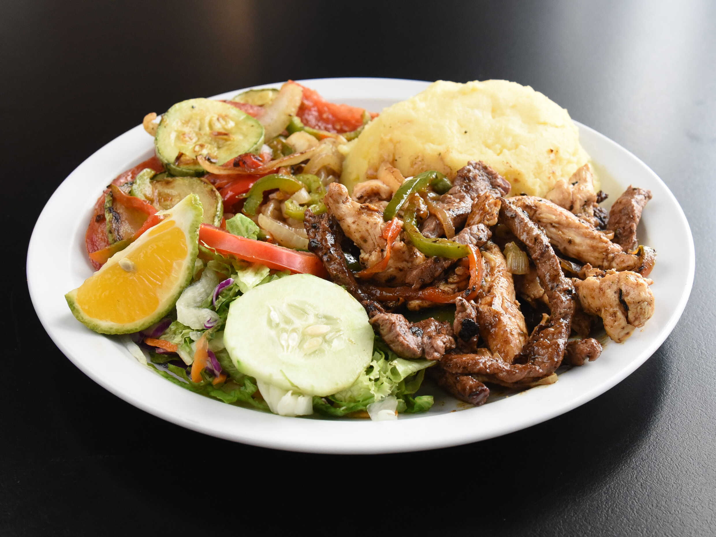 200 gramos de jugosas, exquisitas y sabrosas fajitas (especialidad de la casa), preparada a la parilla., acompañado de pure de papa, vegetales grill y ensalada verde, BEBIDA DE LA CASA GRATIS