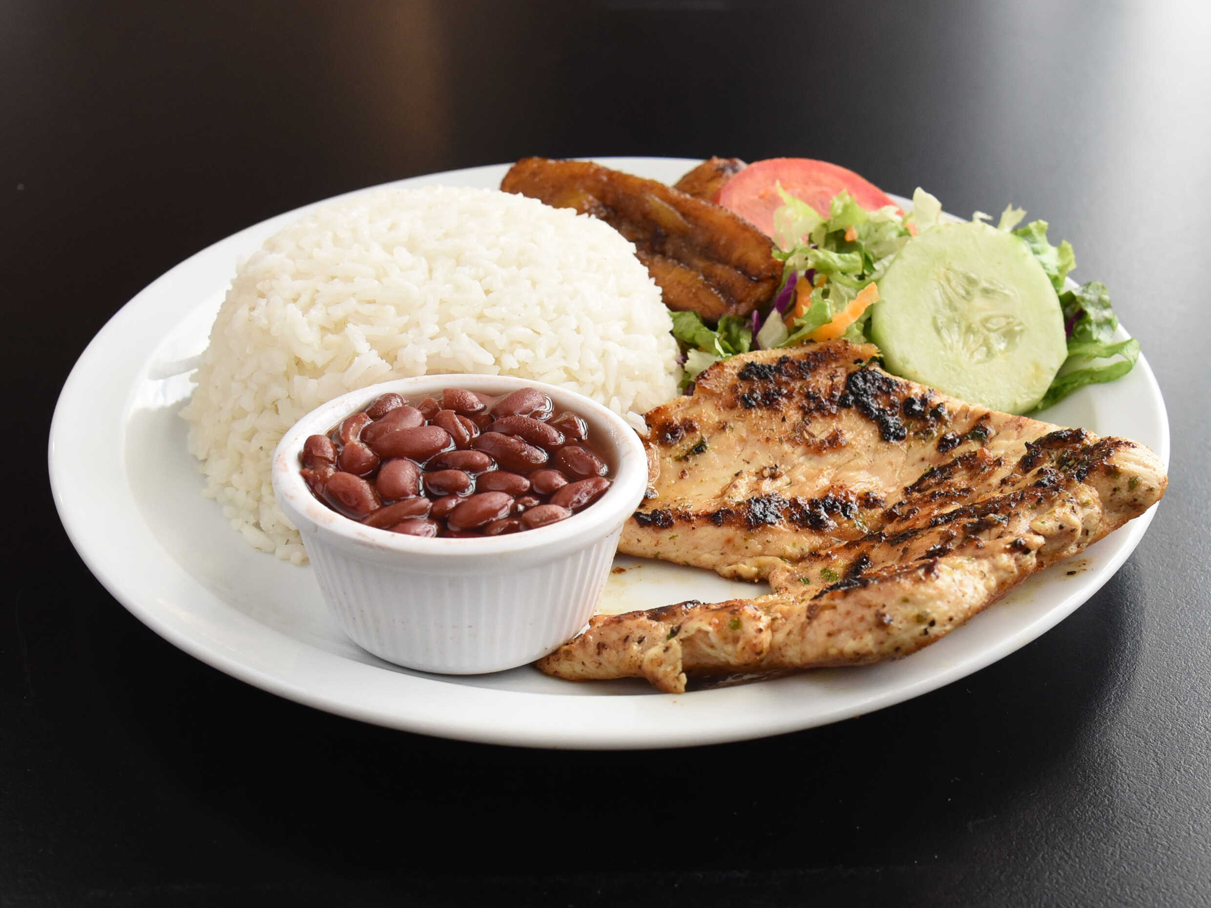 Delicioso casado de 150 gramos de jugoso, exquisito y sabrosa Pechuga de Pollo preparada a la parilla, acampañado de arroz blanco, frijoles rojos, platano maduros, ensalada verde, con BEBIDA DE LA CASA GRATIS.