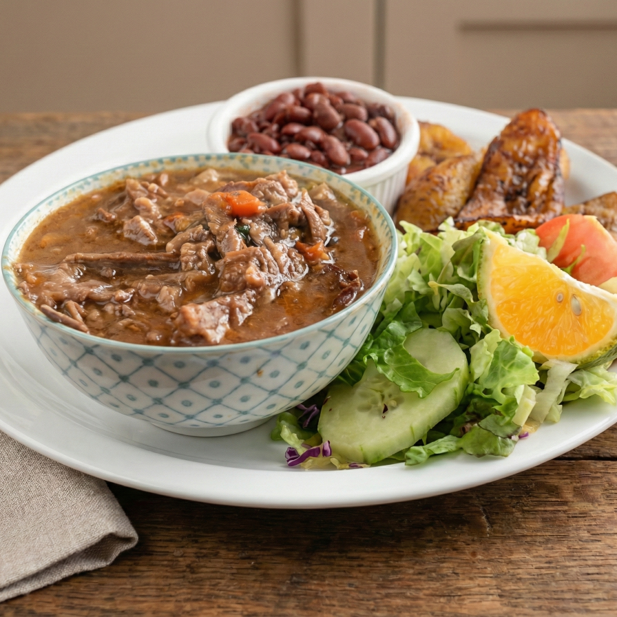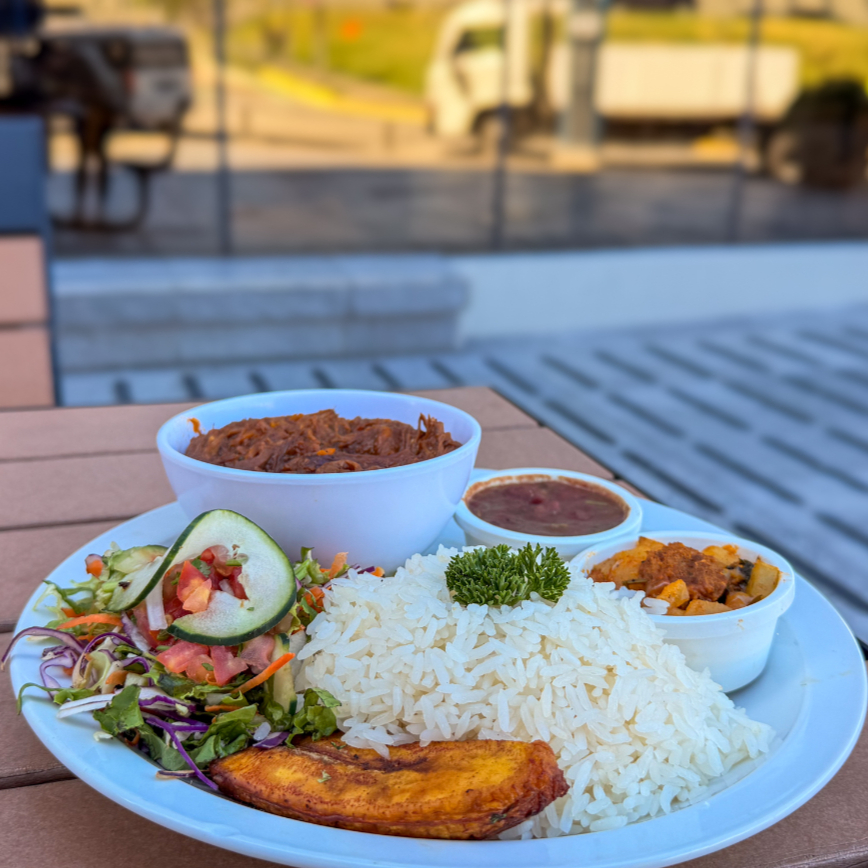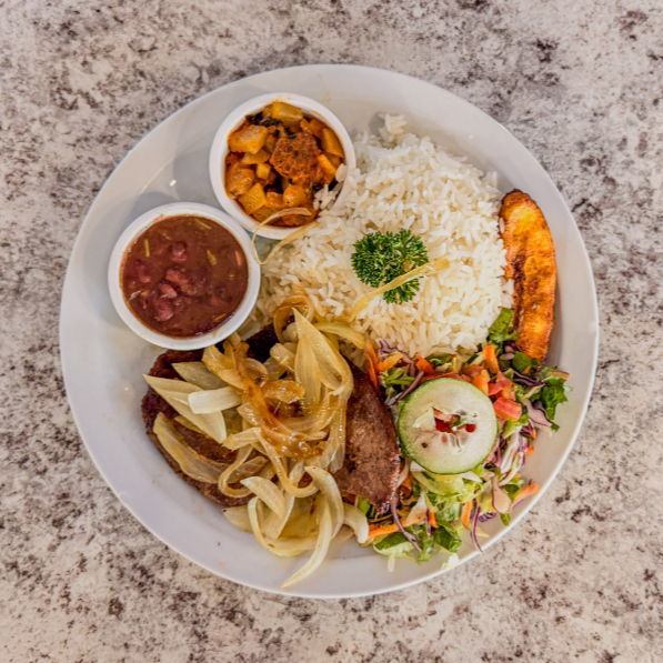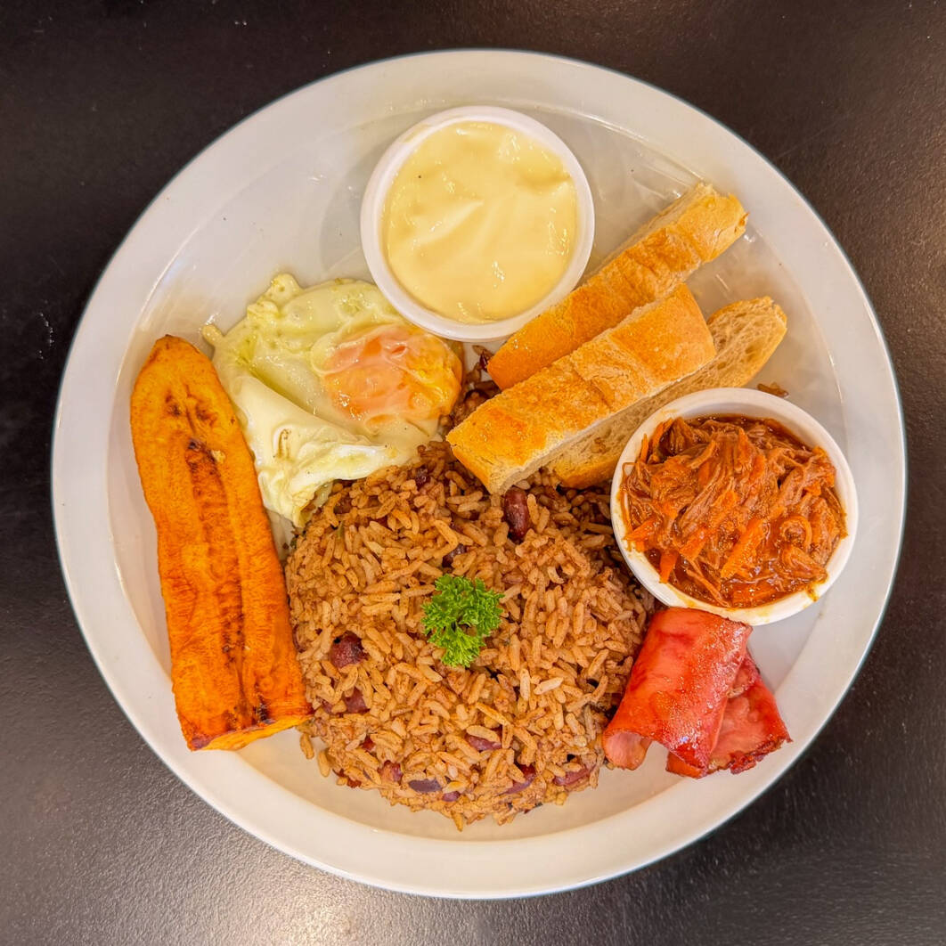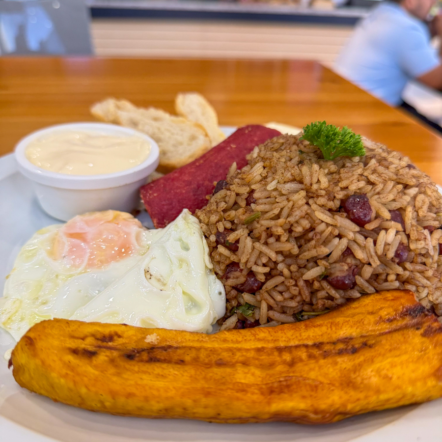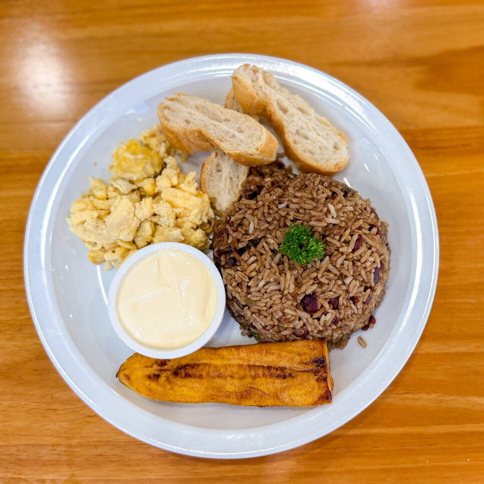 Platillo personal con una deliciosa combinación de arroz, frijoles y olores, acompañado de carne mechada, tocineta, huevos al gusto, natilla, queso o salchichón, plátano maduro, pancito o tortilla, y jugo de naranja (16 onzas) o café (16 onzas).