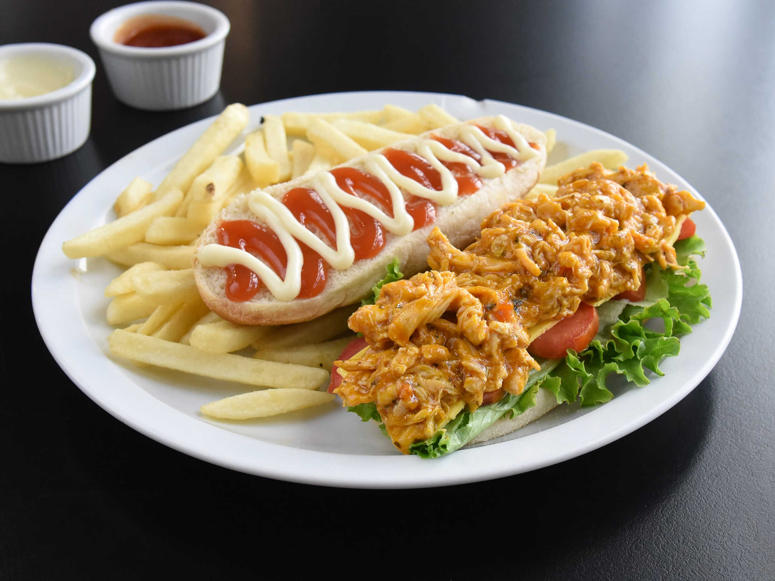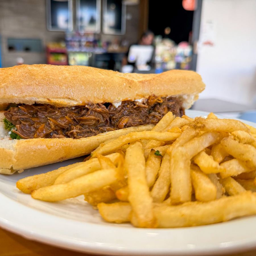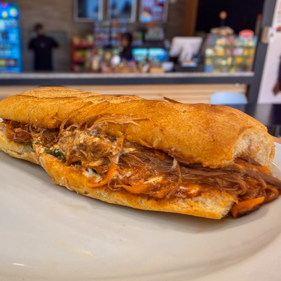 Disfruta de nuestro jugoso y delicioso sandwich con pan baguette, la proteina a escoger, lechuga, tomate, queso americano, salsas, papas fritas y BEBIDA DE LA CASA GRATIS