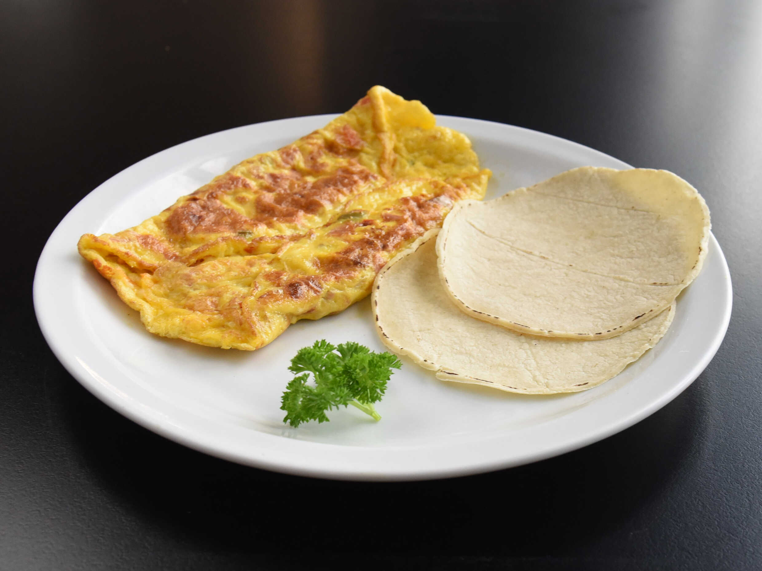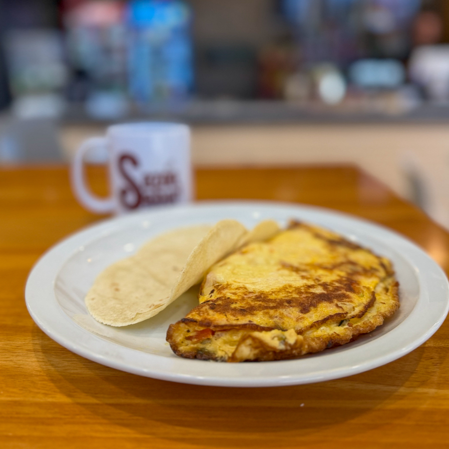 Una deliciosa y sabrosa combinación de 7 ingredientes: huevo, jamón, hongos, queso mozzarella, chile dulce, cebolla, cebollinos y 2 tortillas. JUGO DE NARANJA O CAFE GRATIS