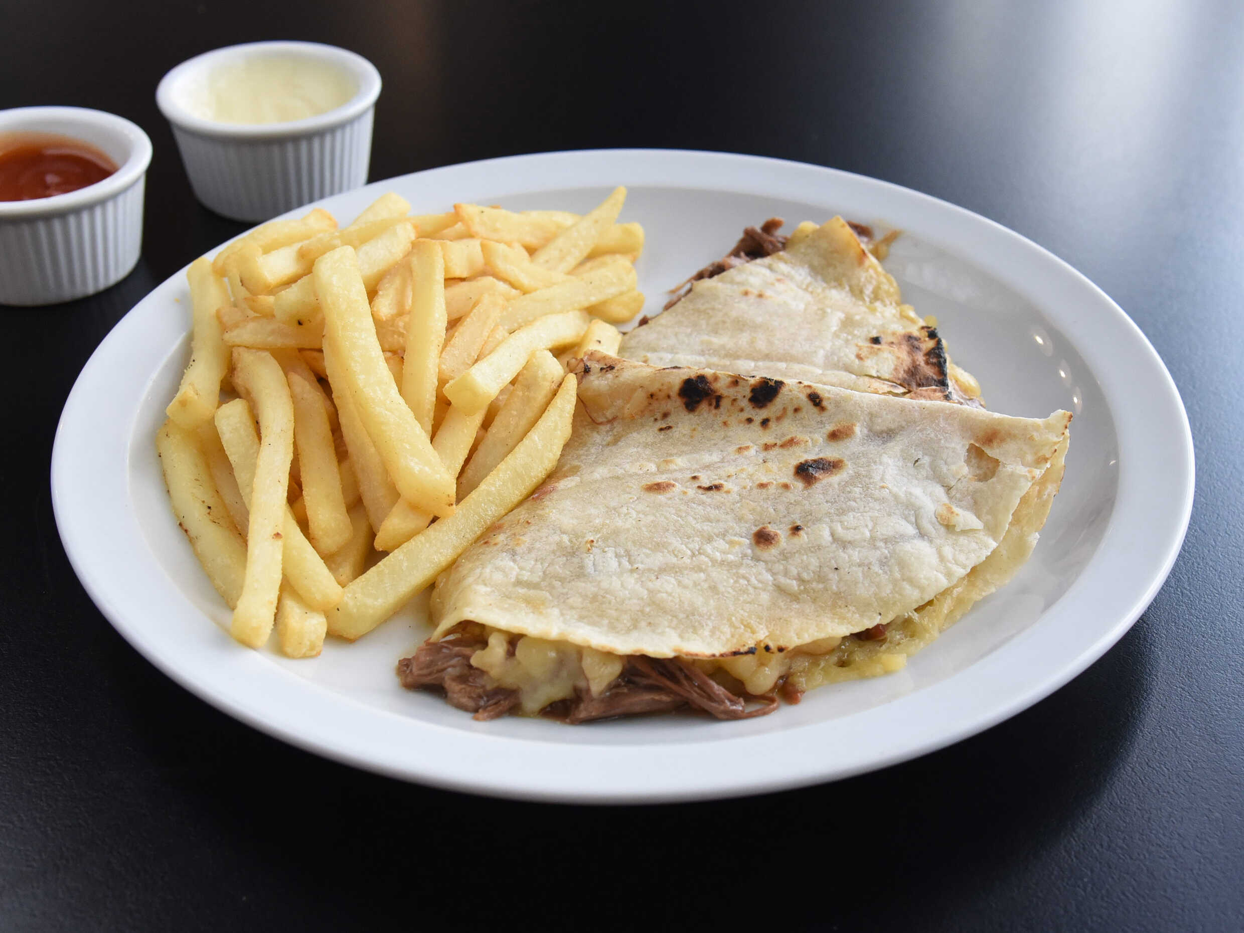 Deliciosa Tortilla de Trigo rellena de la carne mechada, bañada con Queso Mozzarella derretido, acompañado de Papitas Fritas y BEBIDA DE LA CASA GRATIS