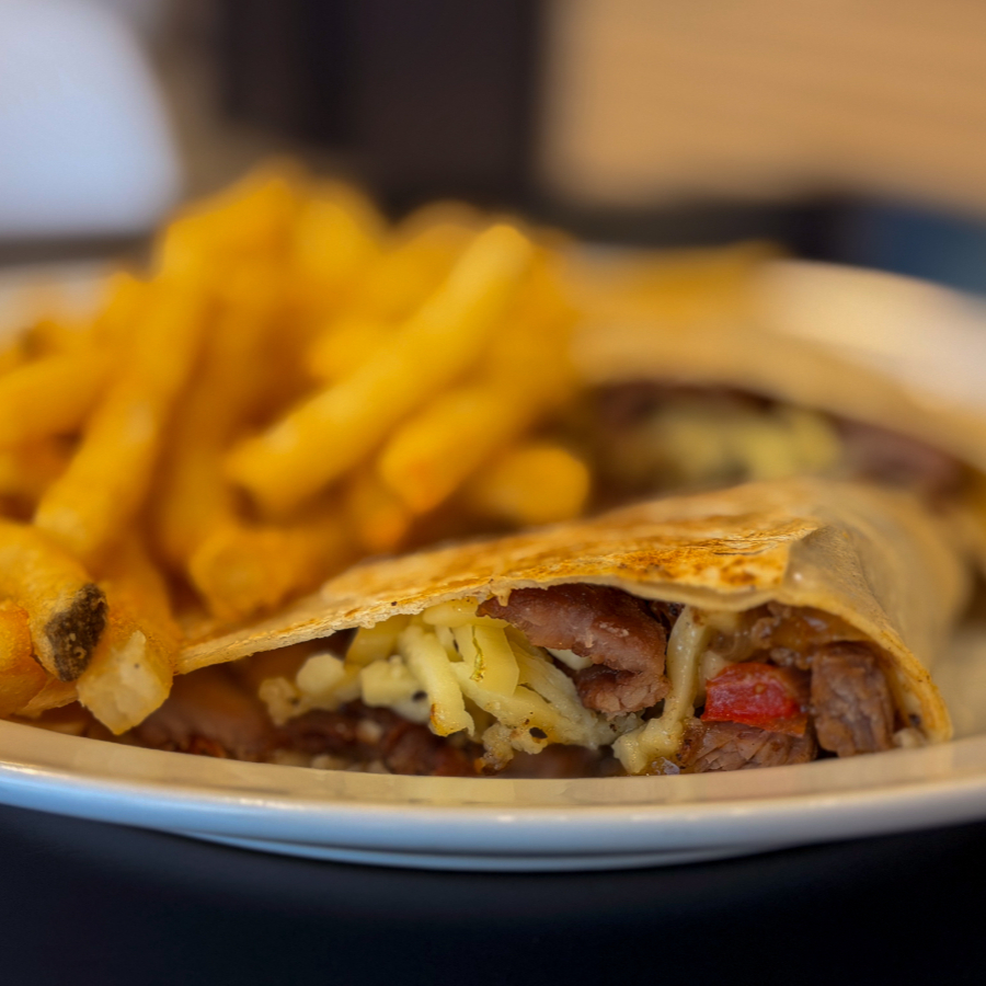 Deliciosa Tortilla de Trigo rellena de Fajitas de Res (ESPECIALIDAD DE LA CASA), cocidas con Chile dulce y cebolla, bañada con Queso Mozzarella derretido, acompañado de Papitas Fritas y BEBIDA DE LA CASA GRATIS