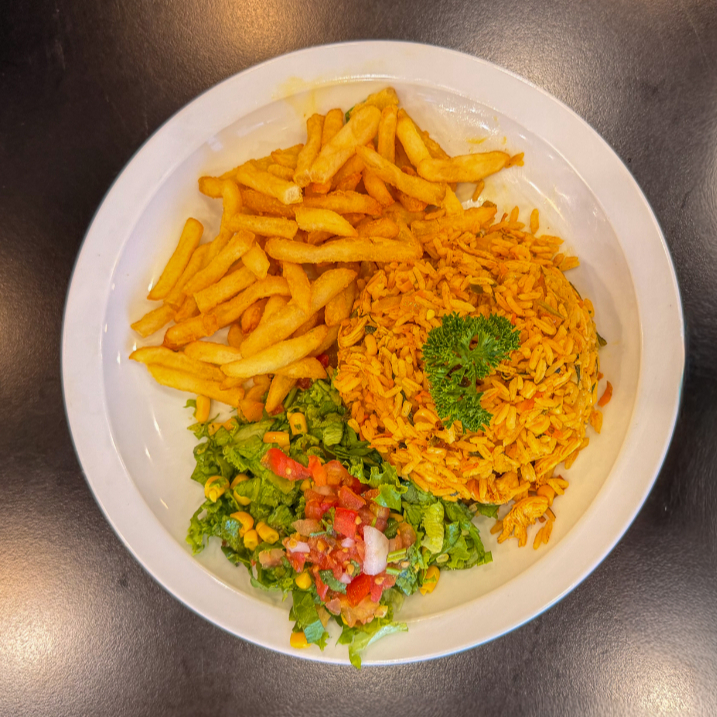 Exquisita selección de camarones frescos combinados con vegetales finamente picados, acompañado con papitas fritas, ensalada verde y BEBIDA DE LA CASA GRATIS