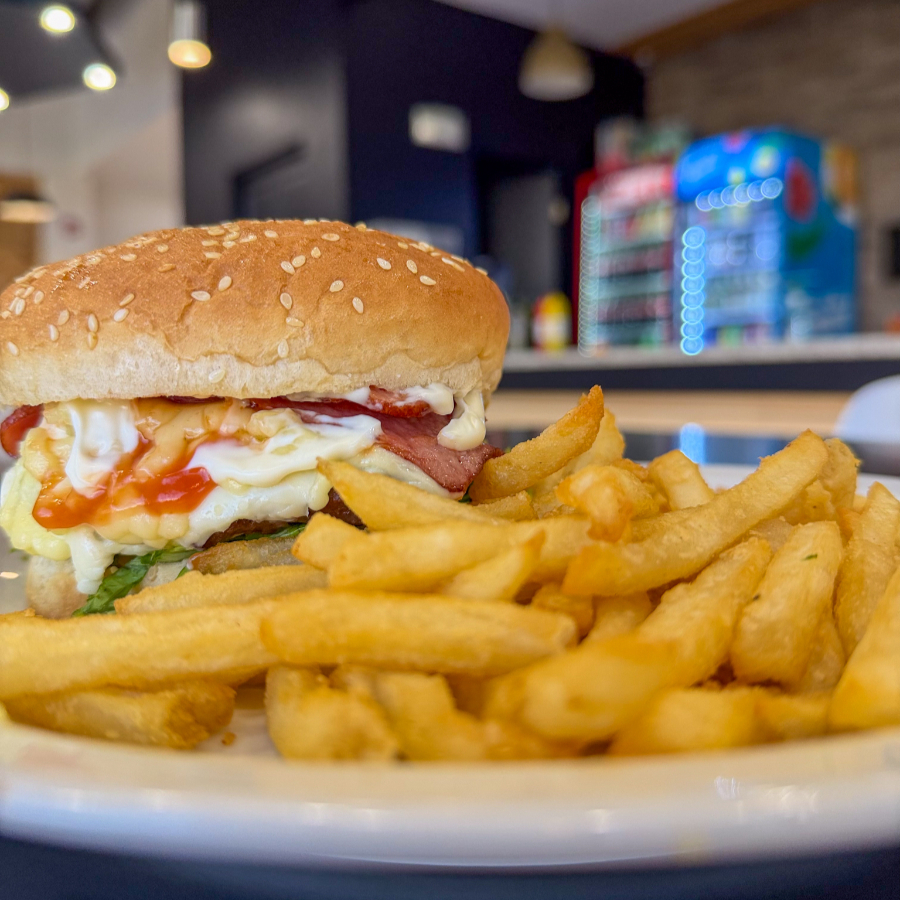Deliciosa Torta de Carne cocinada a la parrilla, queso americano, lechuga, tomate, salsa de tomate, mayonesa, papas fritas y BEBIDA DE LA CASA GRATIS
