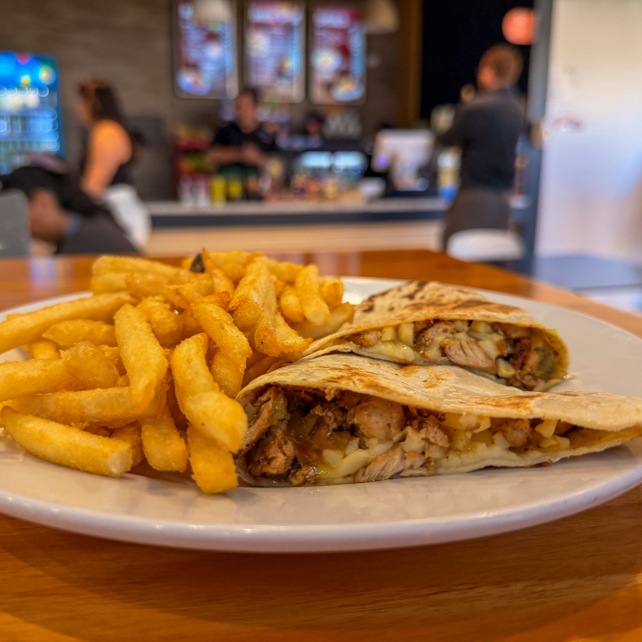 Deliciosa Tortilla de Trigo rellena de Fajitas de Pollo (ESPECIALIDAD DE LA CASA), cocidas con Chile dulce y cebolla, bañada con Queso Mozzarella derretido, acompañado de Papitas Fritas y BEBIDA DE LA CASA GRATIS