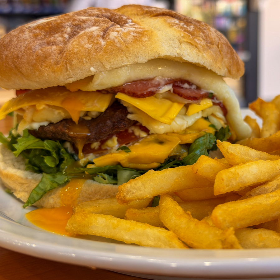 2 Deliciosas Tortas de Carne a la parrilla, con huevo frito, queso americano, queso blaco. queso mozarella, Bacon, cebolla Salteadas, lechuga, tomate, con salsa BBQ acompañados de papitas fritas y BEBIDA DE LA CASA GRATIS