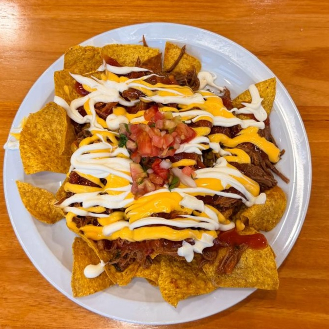 Deliciosas y recién hechas Tortillitas tostadas, acompañadas con la carne mechada, frijolitos molidos, bañadas con delicioso queso cheddar, pico de gallo, natilla y BEBIDA DE LA CASA GRATIS