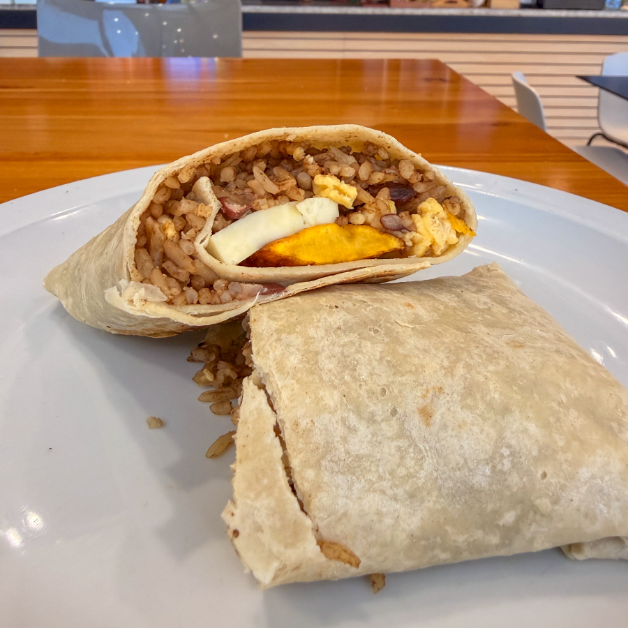 Deliciosa tortilla de trigo con pinto recién preparado, huevos revueltos, queso turrialba, maduro. y JUGO DE NARANJA O CAFE GRATIS