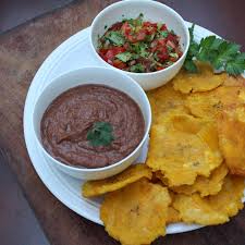 5 Patacones acompañados con frijoles molidos y pico de gallo.