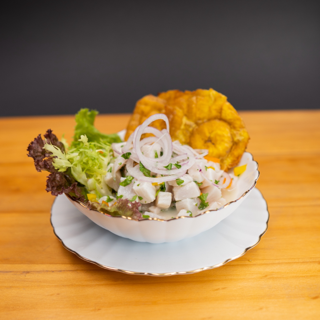 Delicioso ceviche de pescado, chile, cebolla morada y culantro acompañado de patacones