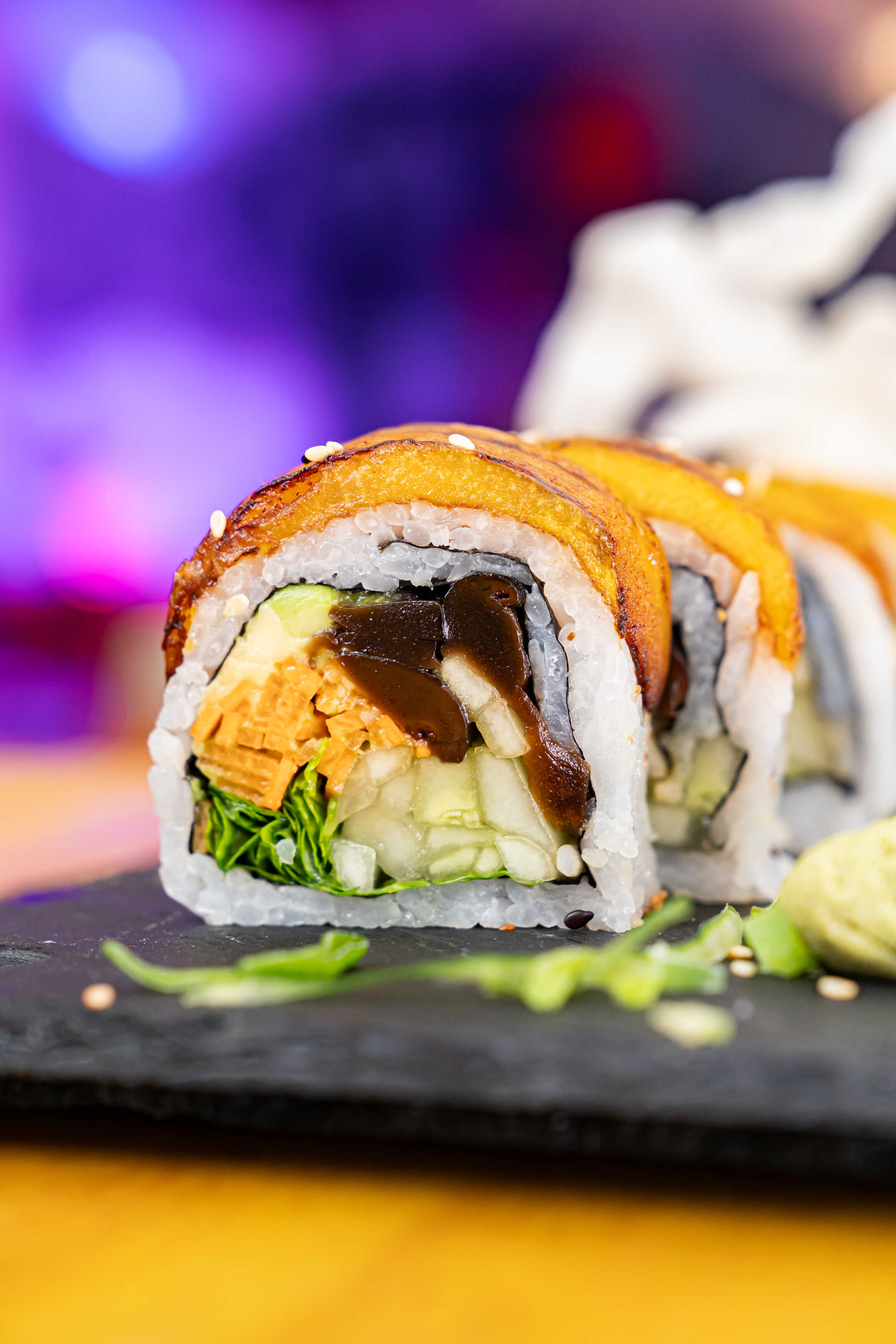 Pepino, aguacate, shitake, zanahoria y lechuga cubierto de plátano maduro. 10 Piezas.
