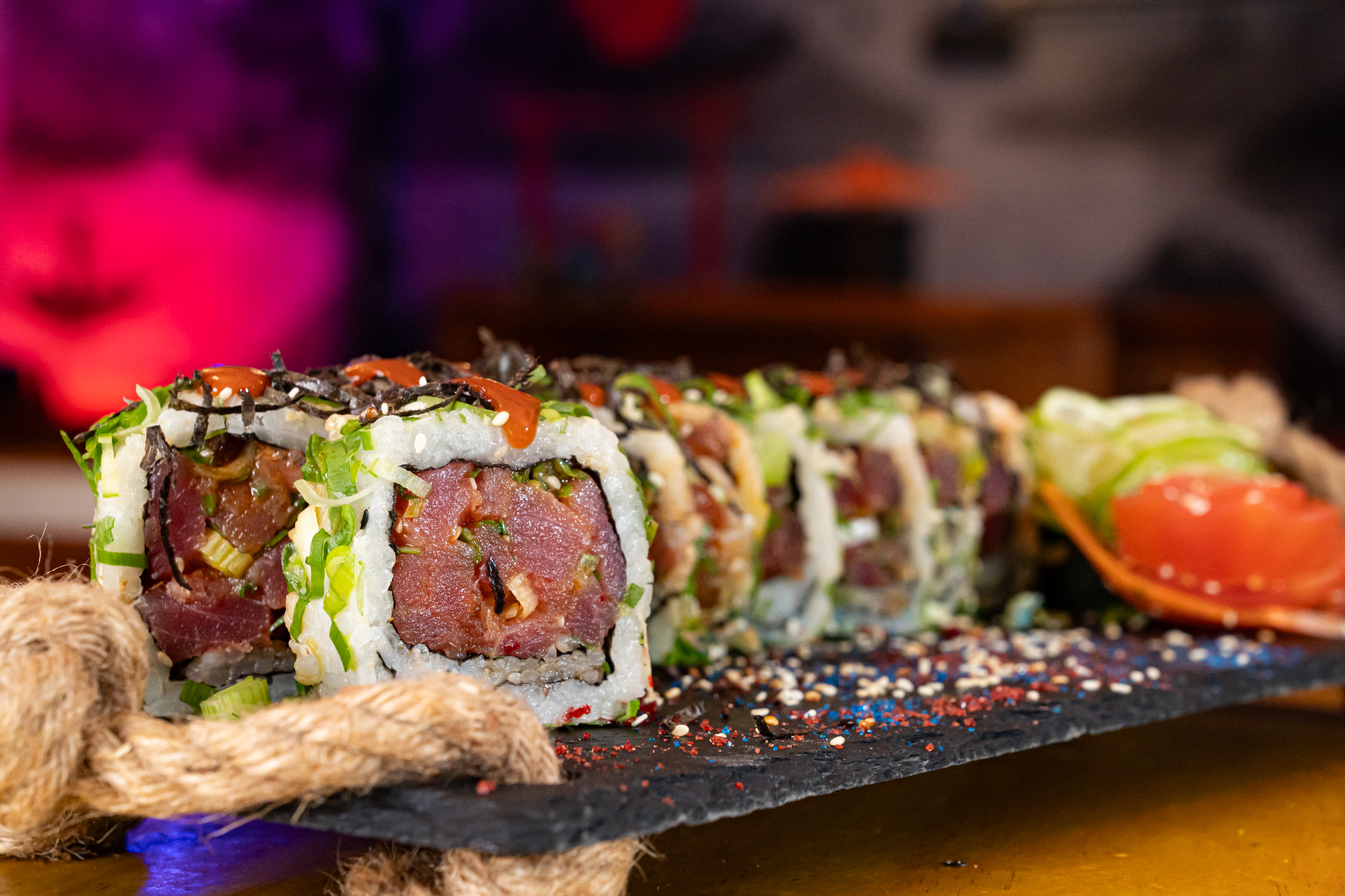 Atún, cebollino, salsa picante, cobertura de alga nori en tiras y cebollino. 10 Piezas.