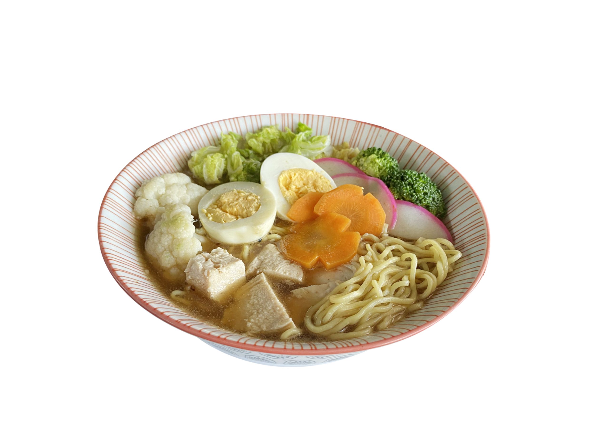 Proteína de pollo o cerdo, huevo, brócoli, coliflor, cebollino, zanahoria, kamabuko y fideo ramen.
