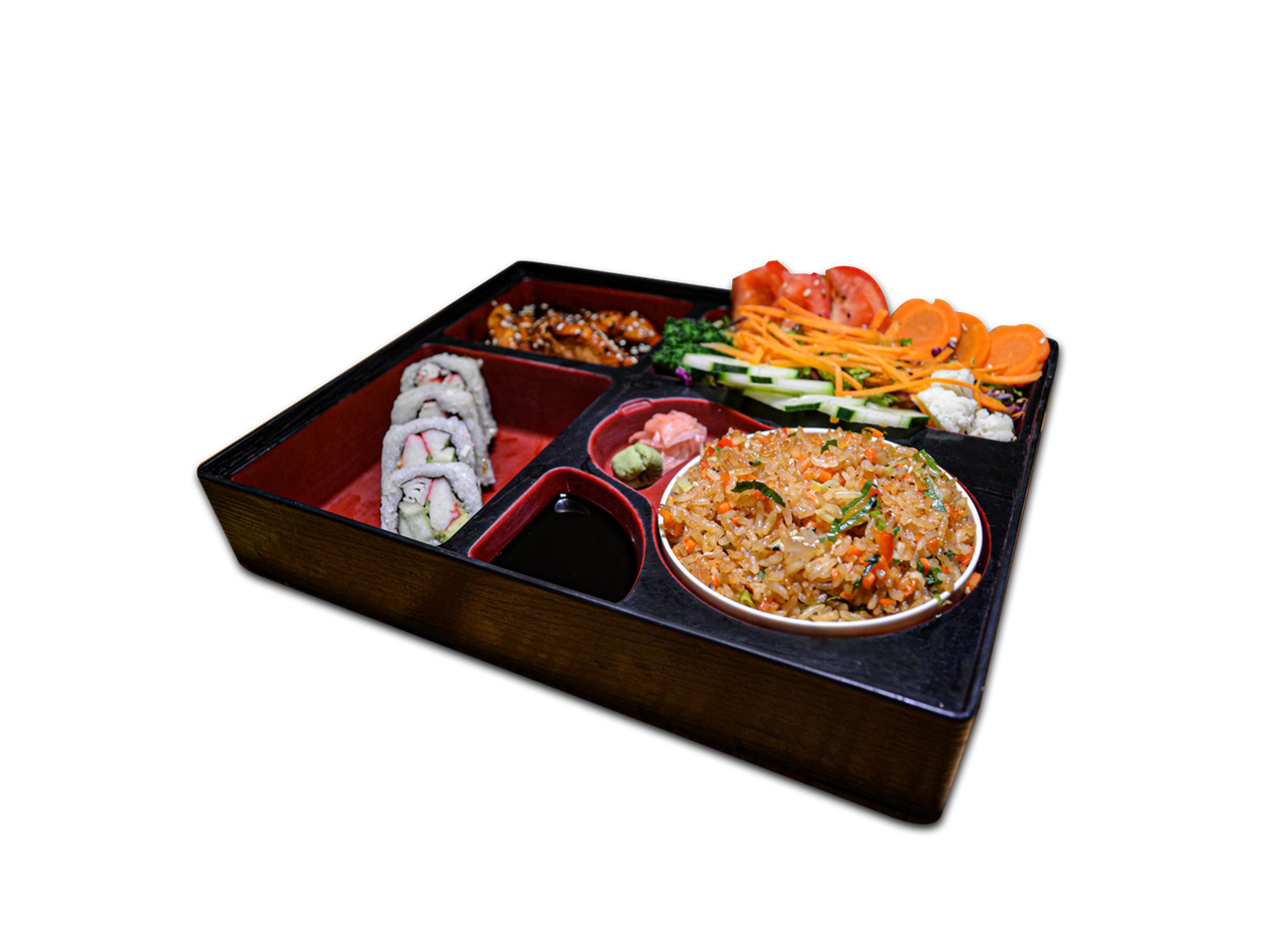 Pollo teriyaki, arroz yakimeshi y california roll (4 pzas). Acompañado de sopa miso, ensalada, té frío de la casa y postre.