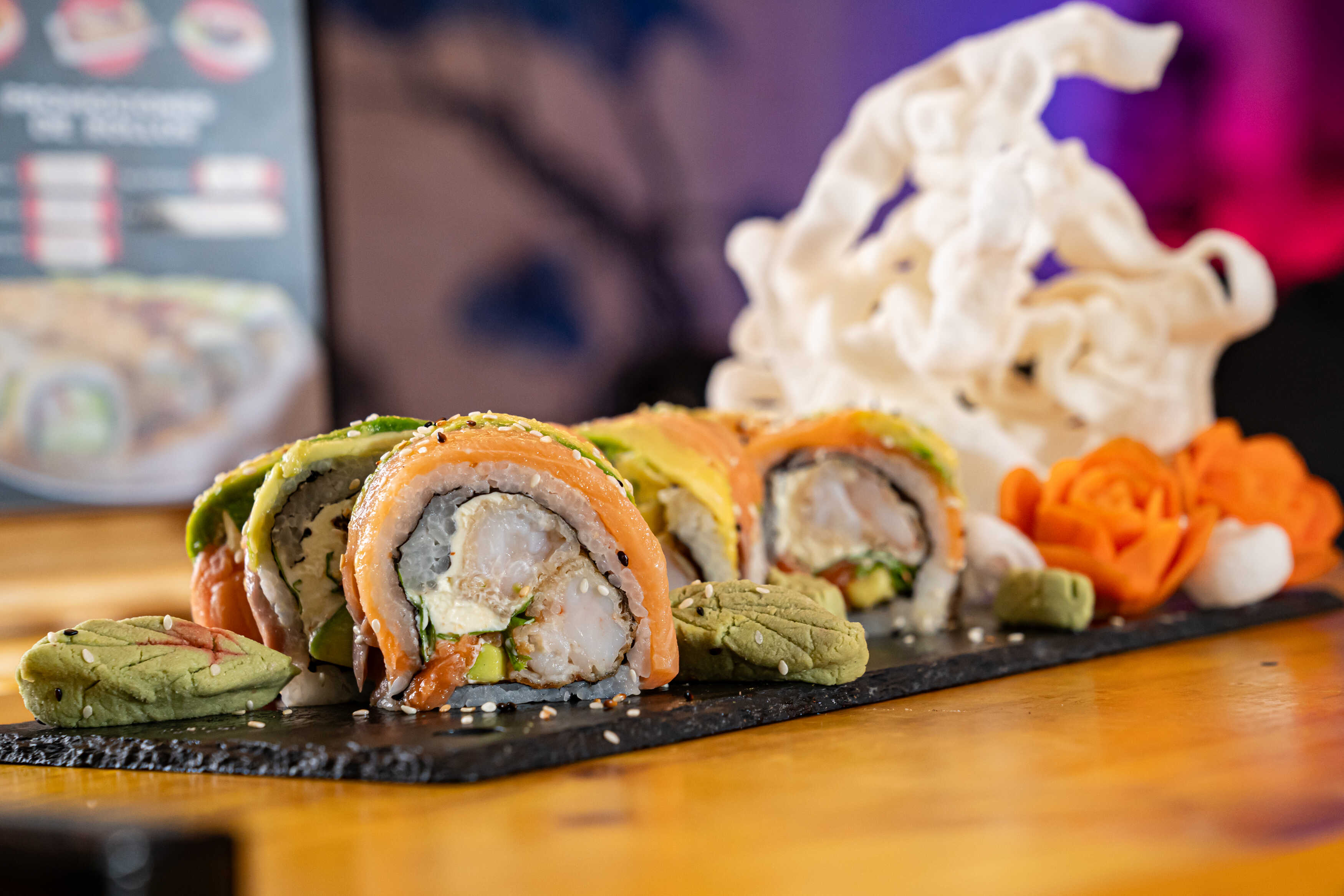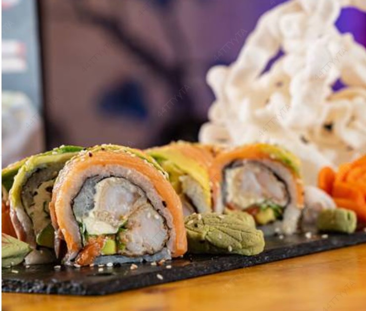 Camarón tempura, aguacate, queso crema, cubierto de plátano maduro y aguacate. 10 Piezas.