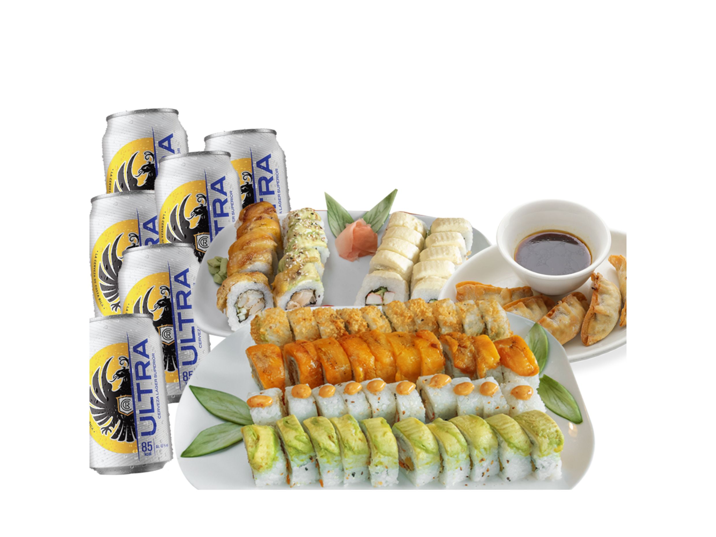 40 Piezas de sushi, 4 sopas miso, 4 gyozas de pollo y 4 Imperial Ultra 473 ml o Tropical 500 ml.