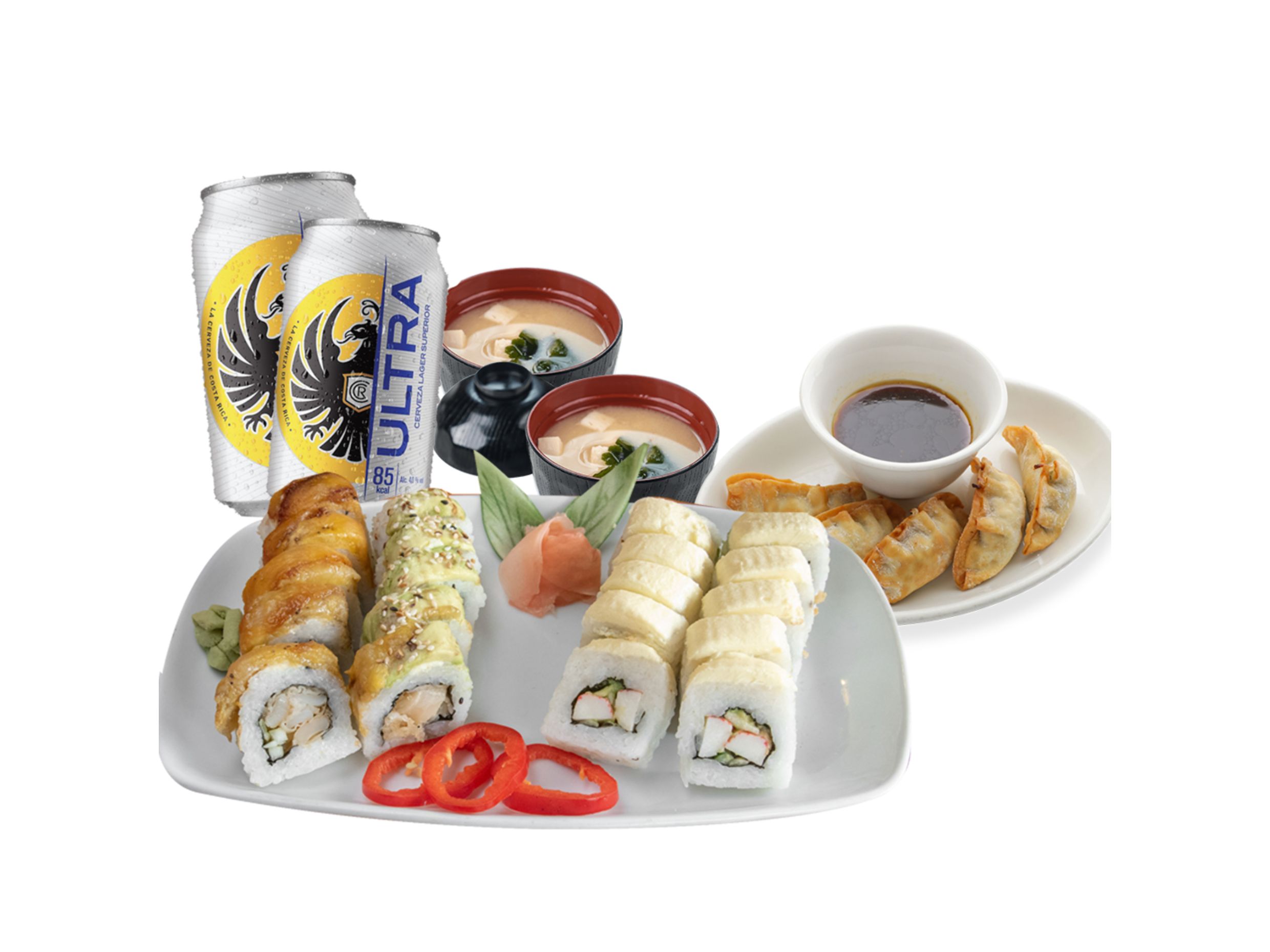 20 Piezas de sushi, 2 sopas miso, 4 gyozas de pollo y 2 Imperial Ultra 473 ml. o Tropical 500 ml.