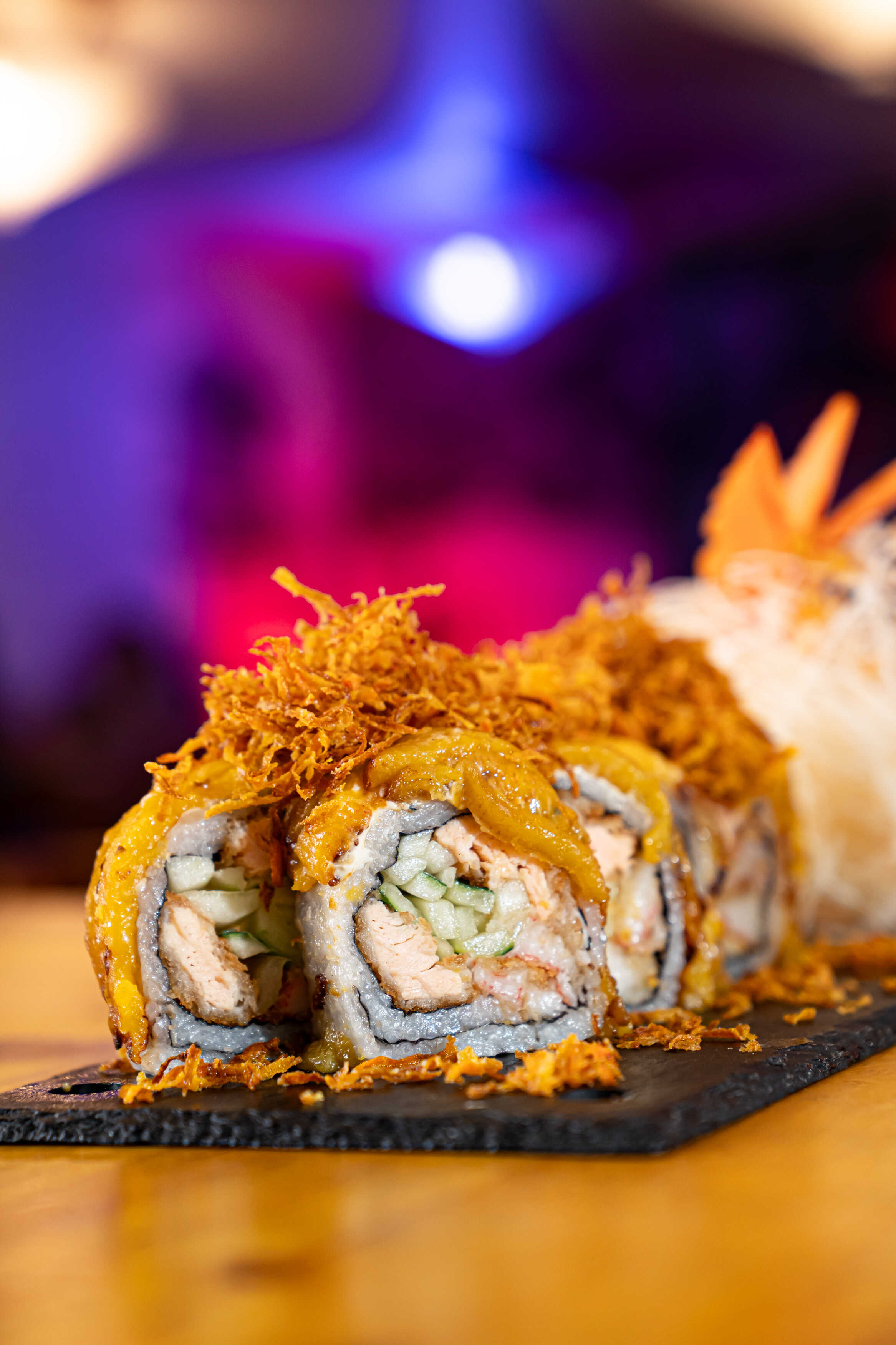 Salmón empanizado, surimi, pepino, zanahoria frita y cubierto de plátano maduro. 10 Piezas.
