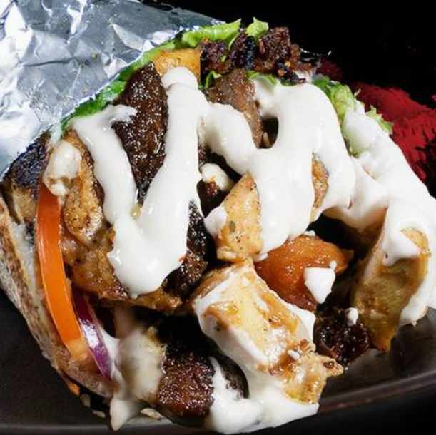 Shawarma de res con pollo, lechuga, tomate, cebolla, salsa de ajo y salsa tahini.
